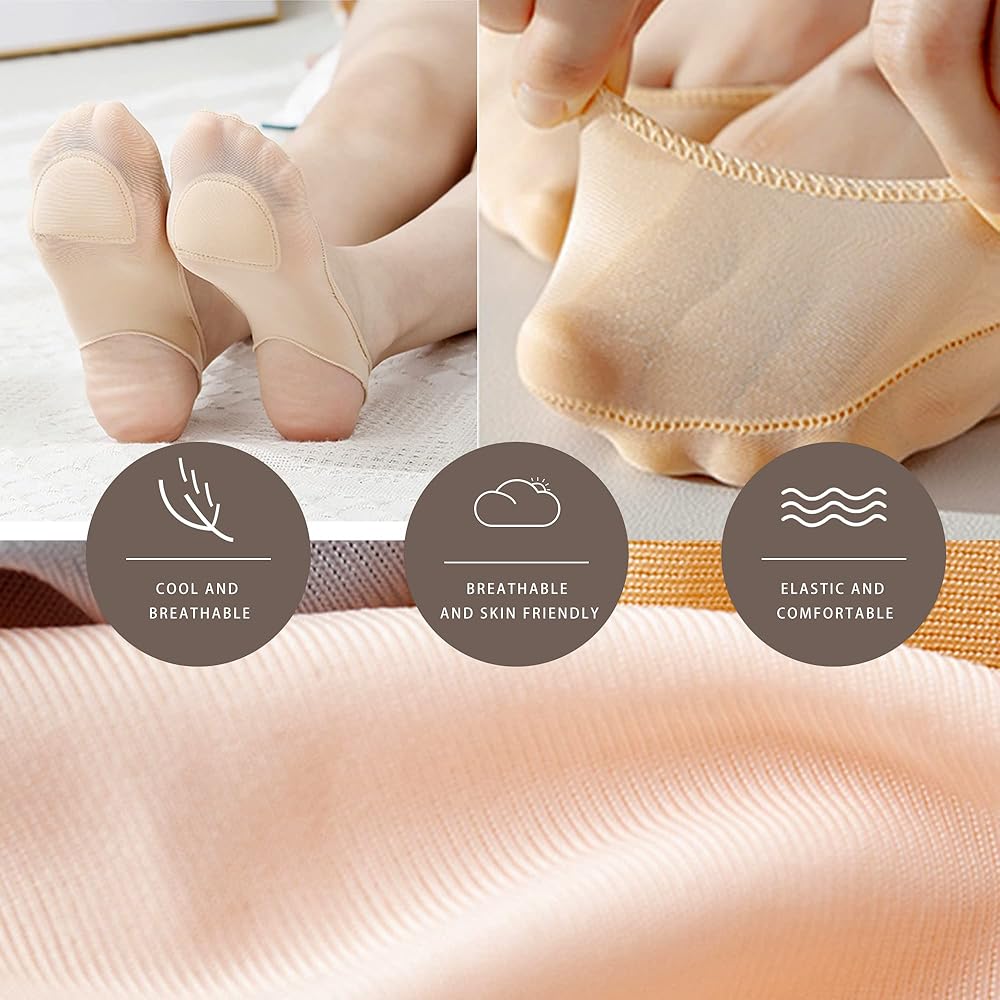 وسادات على شكل جورب - تصميم الجورب يناسب القدم بشكل أفضل ولن ينزلق بسهولة. مصممة للنساء، يمكن أن يخفف ارتداء جوارب القدم الأمامية بشكل فعال الضغط على القدم الأمامية وتعب المشي، ويوفر الدعم للقدم الأمامية، خاصة للنساء اللاتي يرتدين الكعب العالي أو المشي أو الوقوف لفترات طويلة من الوقت.