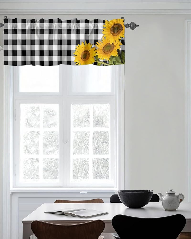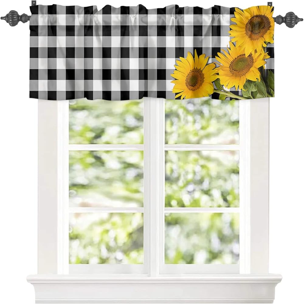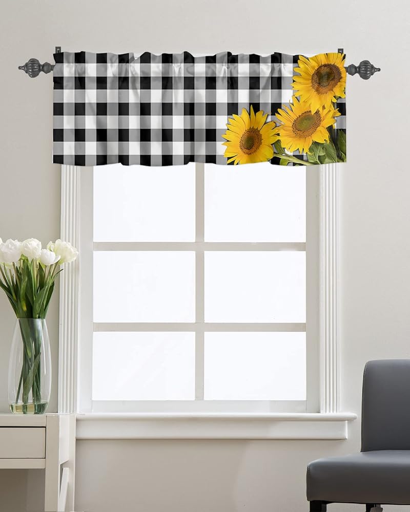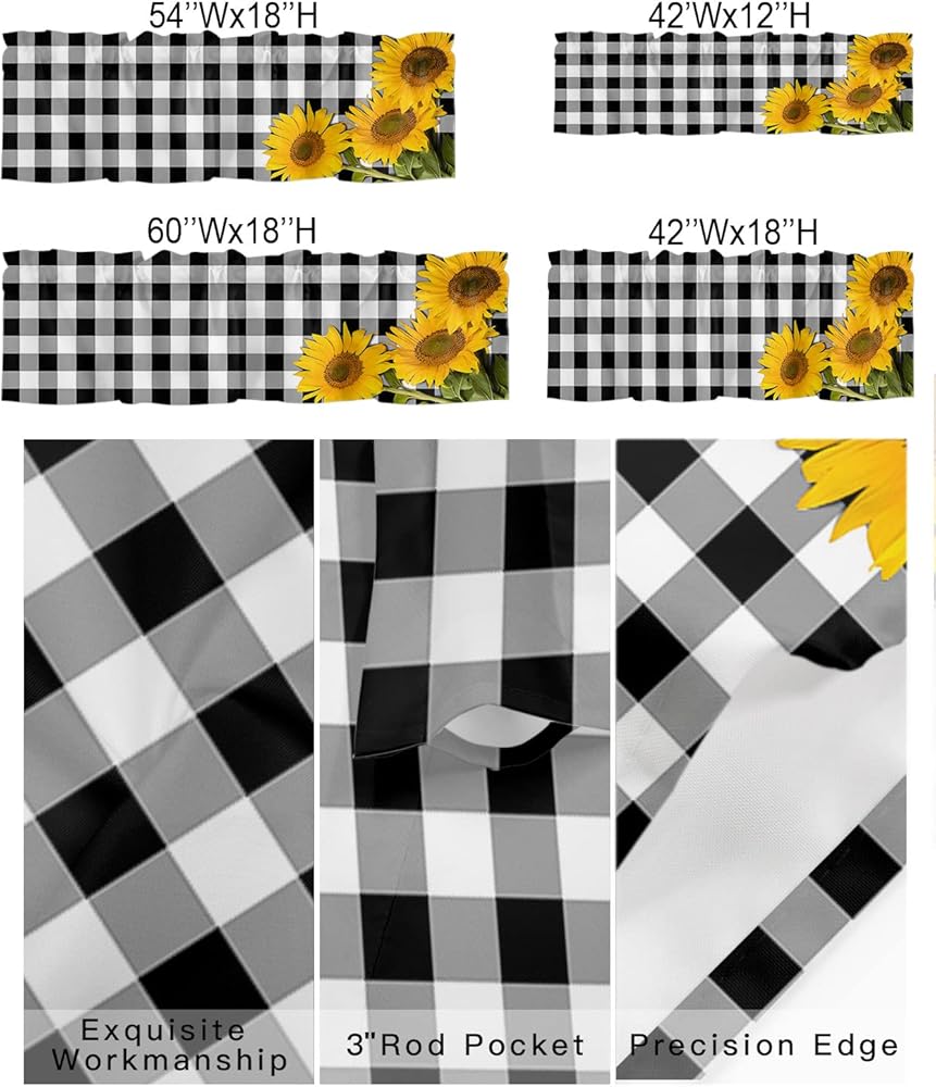 ستائر نافذة جيب قضيب الربيع ريفي ريفي مزرعة عباد الشمس ستائر قصيرة للنوافذ، 54 × 18 بوصة ستارة علوية ستارة جاموس منقوشة للمطبخ/غرفة المعيشة/الحمام أسود أبيض