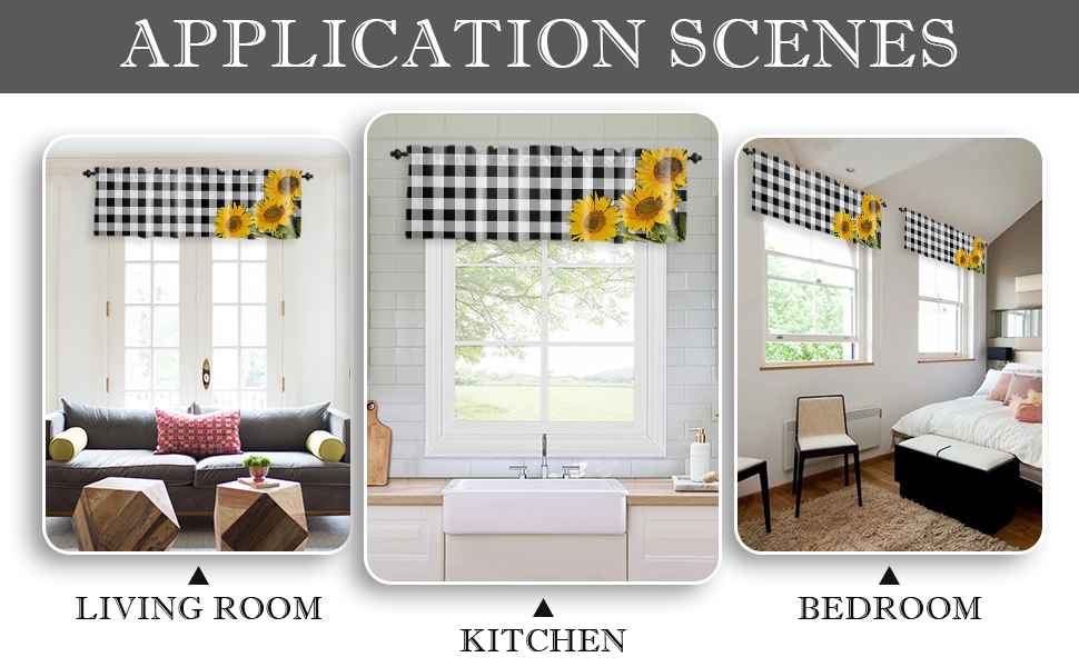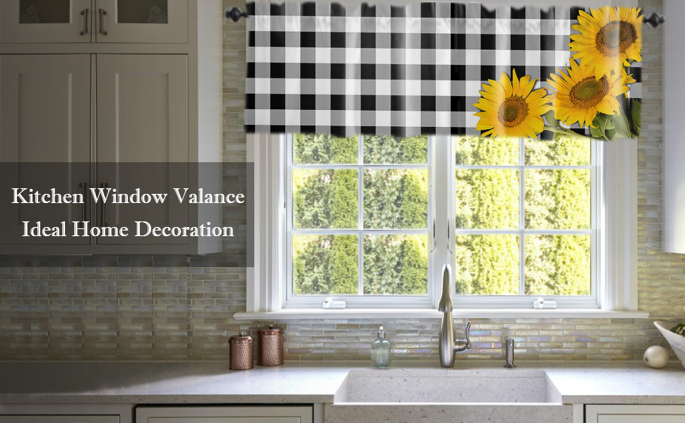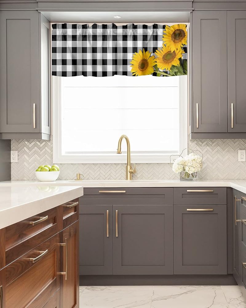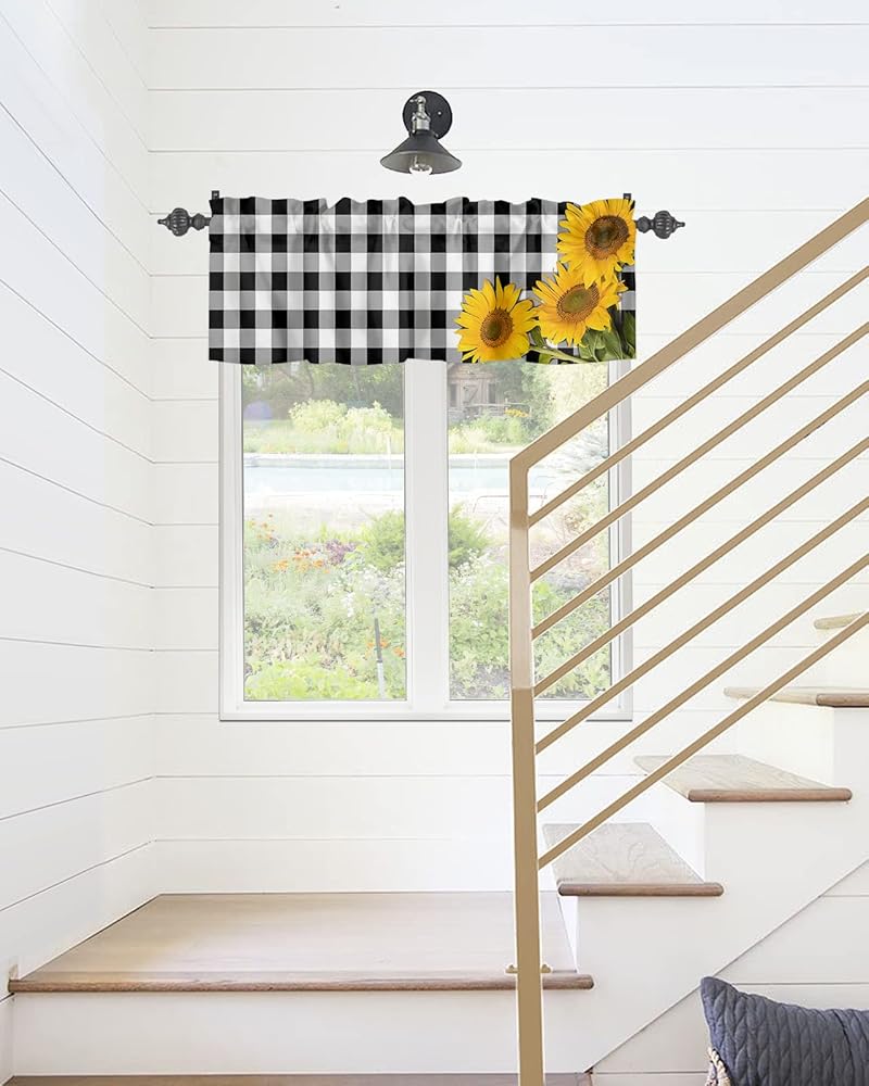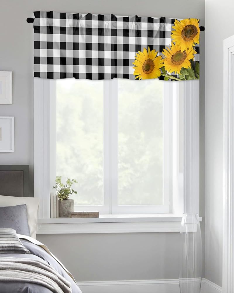 ستائر نافذة جيب قضيب الربيع ريفي ريفي مزرعة عباد الشمس ستائر قصيرة للنوافذ، 54 × 18 بوصة ستارة علوية ستارة جاموس منقوشة للمطبخ/غرفة المعيشة/الحمام أسود أبيض
