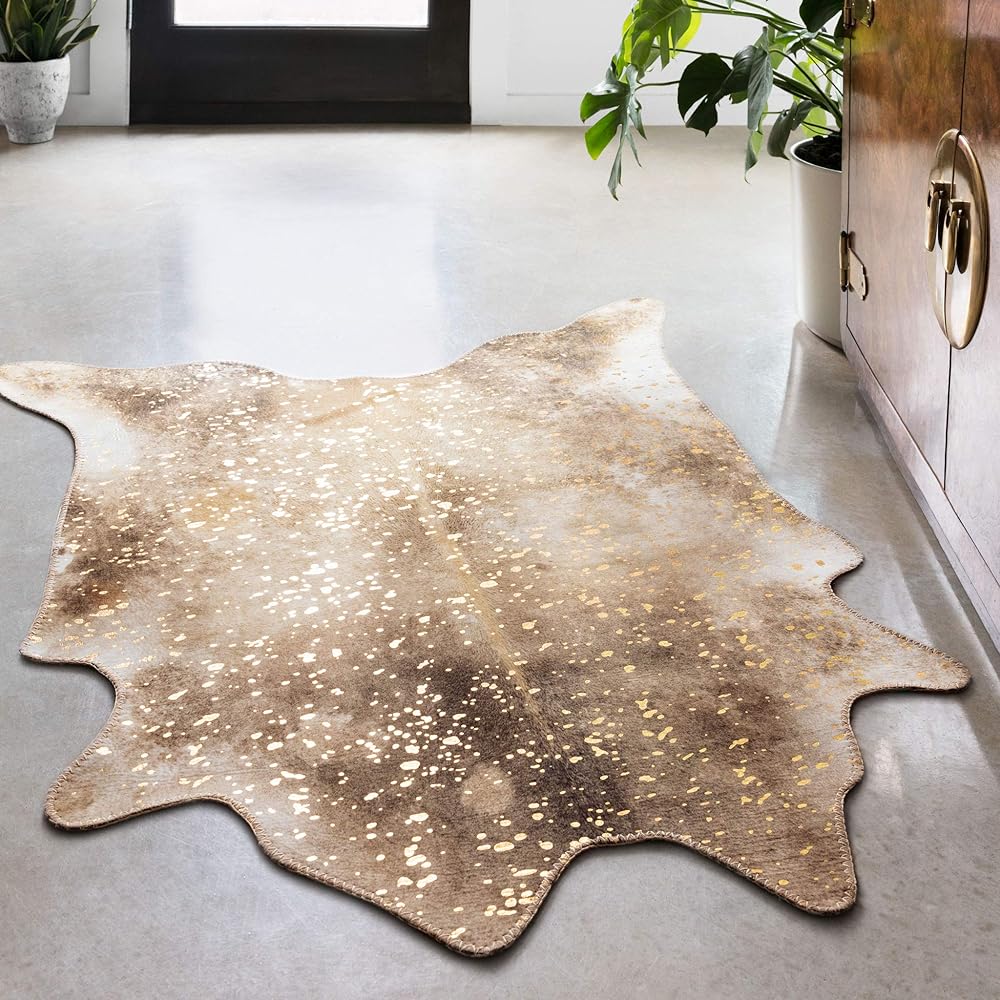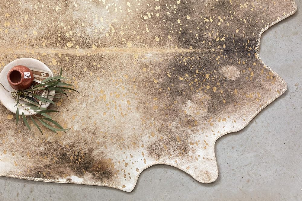 Printed in China of 100% polyester, the Odessa Collection is a modern take on a classic cowhide rug, and elevates the room with artfully placed gold and silver metallic accents. Odessa is a budget-friendly alternative for cowhide rugs, with long-lasting durability and easy maintenance.