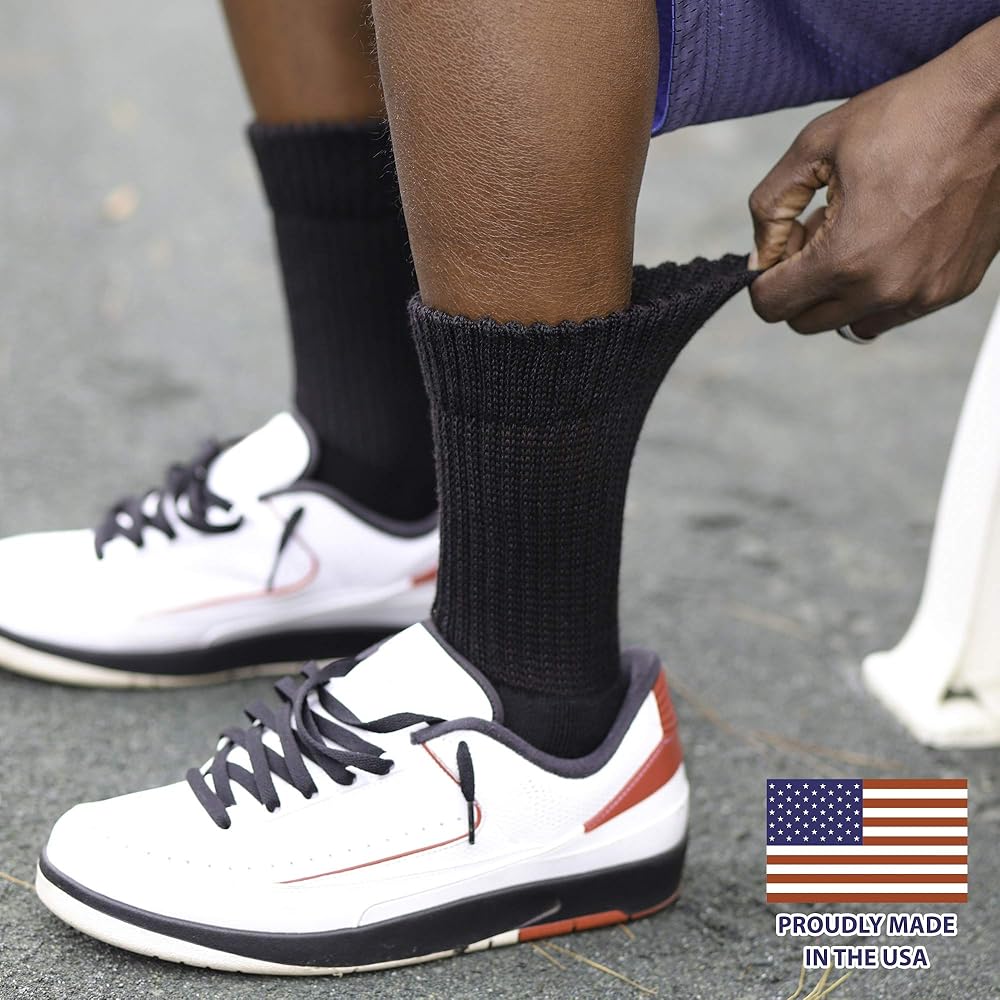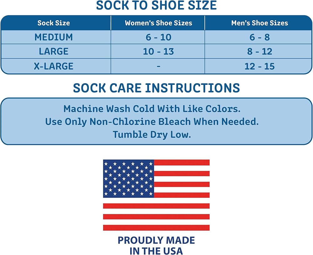 صُنع في الولايات المتحدة الأمريكية: جوارب Doctor's Choice النشطة لمرضى السكري مصنوعة من 71% بوليستر، 12% نايلون، 7% موهير، 7% صوف ميرينو، 2% مطاط، 1% ألياف لدنة. متوسط: مقاس حذاء رجالي 6-8. كبير: 8-12. كبير جدًا: 12-15.