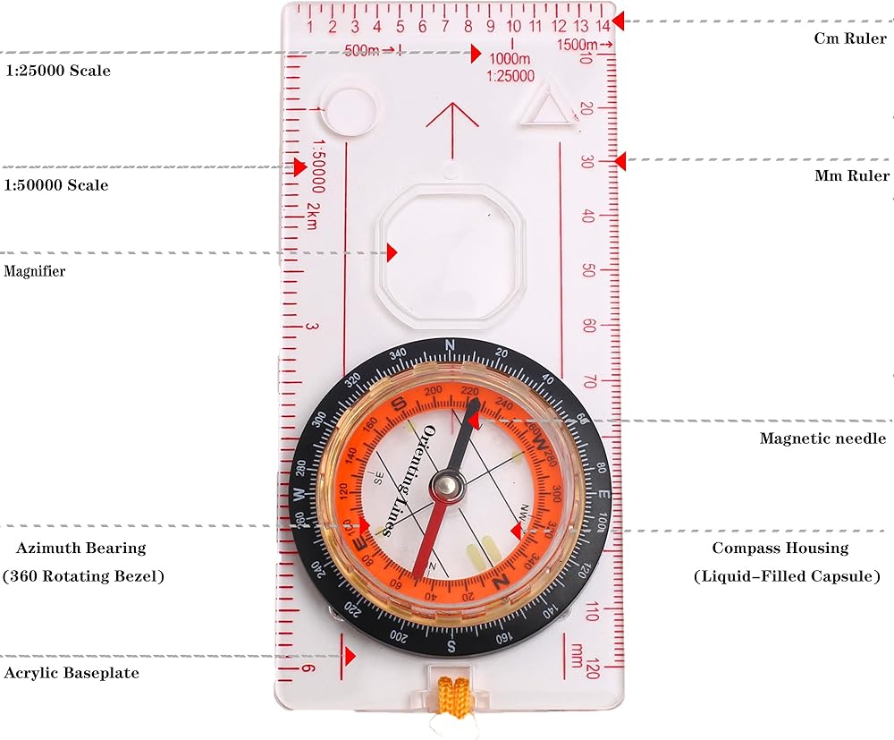 🧭[Versatile Orienteering Compass] The compass hiking survival is designed for outdoor use and consists of an acrylic base plate, an azimuth bearing and a 360-degree rotating bezel. The magnetic needle inside a liquid-filled capsule (bubble-free) swings freely and fast and points you exactly north. Equipped with a magnifying glass to facilitate reading and navigating geological maps. You can also use the 1:24000 compass Ruler Scale of the compass to draw precise routes.