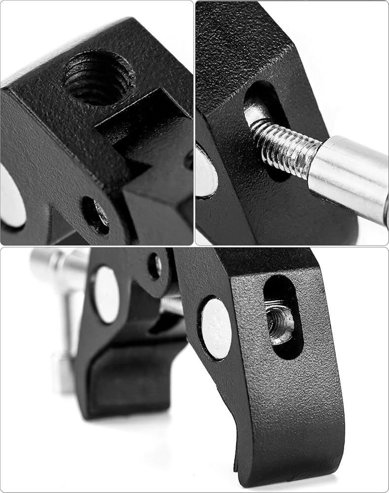 • مشبك فائق: متوافق مع قضبان 9/16-1 7/8 بوصة (15 مم - 47 مم)، تحميل يصل إلى 4.4 رطل (2 كجم). تتميز بفتحات خيط 1/4 بوصة و3/8 بوصة لربط الكاميرات، ومصابيح LED، والمظلات، والخطافات، والأرفف، وقضبان القضبان المتقاطعة وما إلى ذلك.