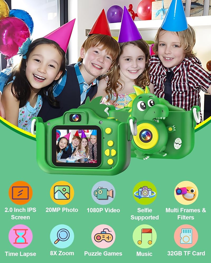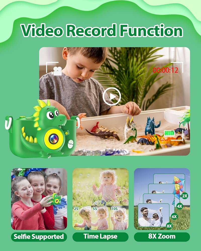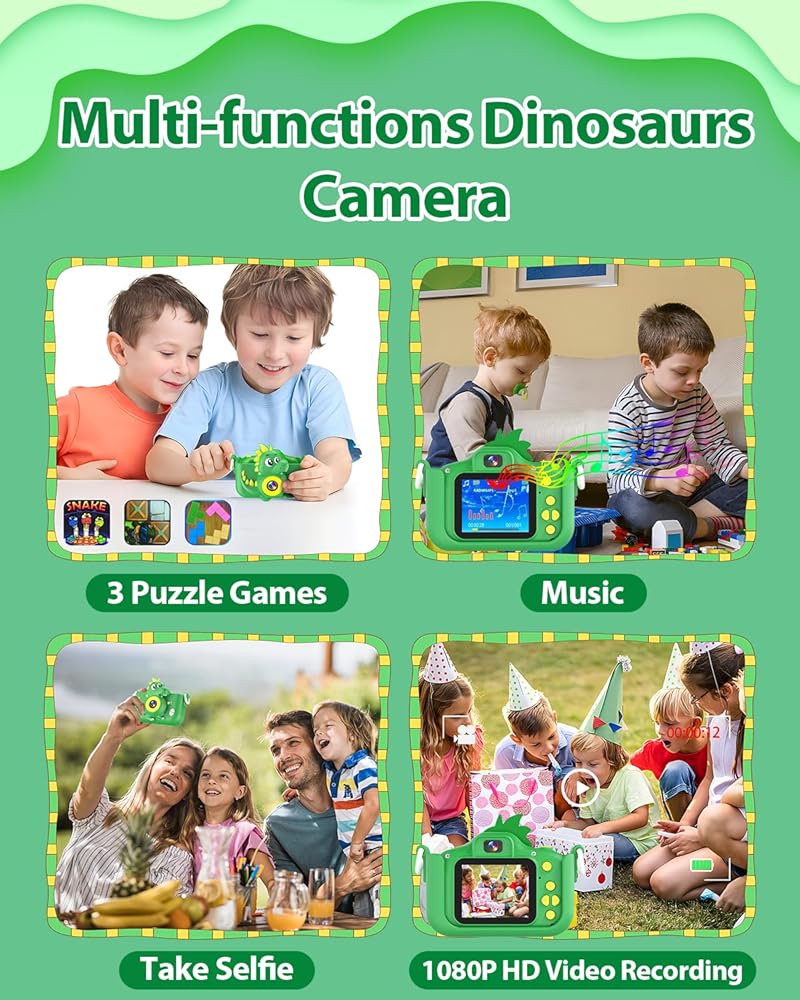 ألعاب كاميرا الأطفال على شكل ديناصور، كاميرا للأطفال مزودة ببطاقة SD سعة 32 جيجابايت وكاميرا رقمية عالية الدقة 1080 بكسل للأطفال مناسبة لعمر 3 4 5 6 7 8 9 سنوات من ألعاب هدايا البنات والأولاد