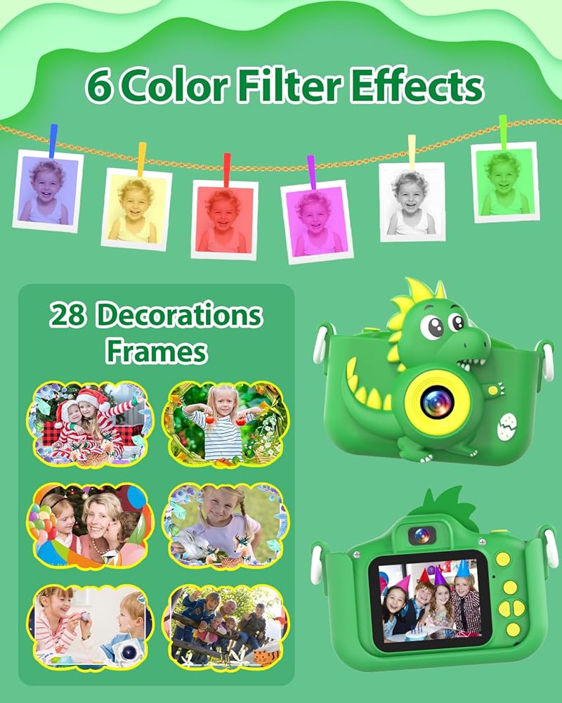 【كاميرا ألعاب الديناصورات متعددة الوظائف】 بالإضافة إلى أساسيات التقاط الصور وتشغيل الموسيقى وتسجيل مقاطع الفيديو ولعب الألعاب، تتميز كاميرا الأطفال المطورة هذه أيضًا بفاصل زمني و28 إطارًا مضحكًا و6 تأثيرات فلتر تضيف لمسة من الألوان إلى الصورة. الصور، مما يجعل التصوير الفوتوغرافي مغامرة إبداعية لطفلك الصغير. تضيف هذه الميزات الرائعة متعة إضافية إلى تجربة الكاميرا الخاصة بطفلك، مما يثير إبداعه وخياله.