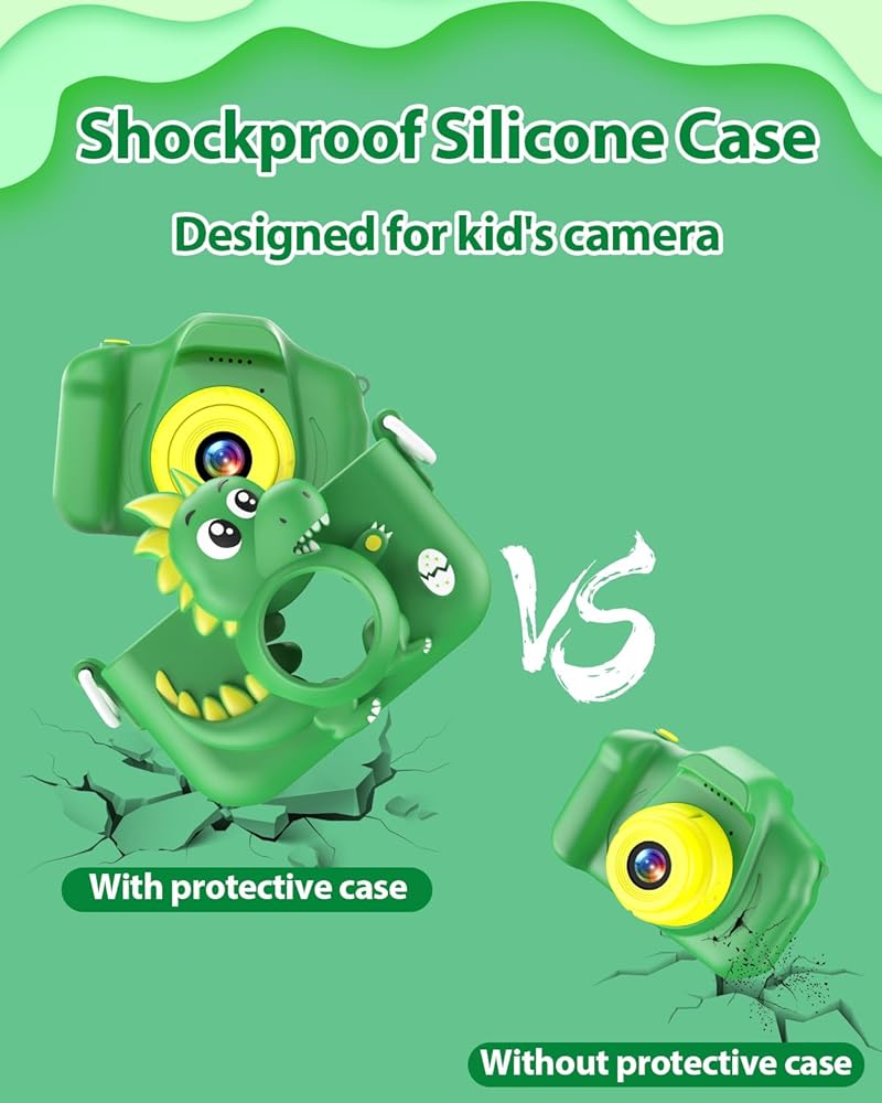 【جراب سيليكون آمن وقوي التحمل】 كاميرات الأطفال من Qupite للأطفال بعمر 5 سنوات تتميز بنمط سيليكون ديناصور فريد مقاوم للصدمات والسقوط وقوي مثل الأظافر. العلبة مصنوعة من السيليكون الصديق للبيئة الآمن وغير السام. بالإضافة إلى ذلك، فهي تأتي مع حبل تعليق عملي، حتى يتمكن مغامرك الصغير من حملها دون القلق بشأن السقوط العرضي.