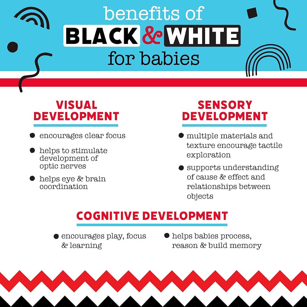A black and white Disney High Contrast black and white baby toy is a fantastic tool to aid in early cognitive development. While baby is focused on a toy you can name the toy and describe all the things it does and move it to make a sound. This will show baby how to play with the toy and also helps to build baby's focus. Giving them the ability to process information, reason, build language & memory.
