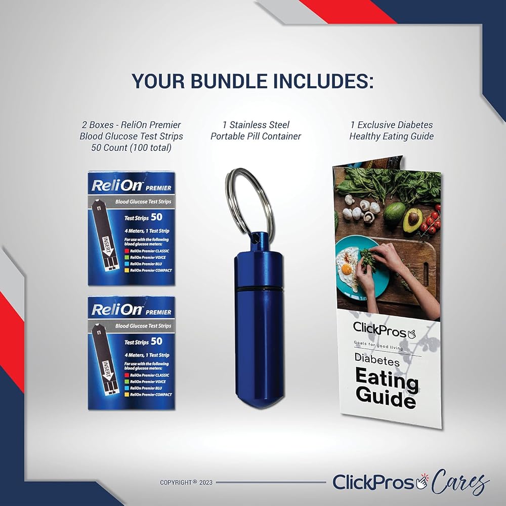 Monitor your blood glucose levels quickly and affordably with ReliOn Premier Blood Glucose Test Strips. Our blood glucose test strips allow you to easily and accurately measure the glucose levels in your blood, with no coding required. With 50 test strips per box, you'll have enough to quickly and conveniently check your blood glucose levels whenever you need. Don't leave your health up to chance, use ReliOn Premier Blood Glucose Test Strips, the test strips you can rely on. ReliOn understands all the ways diabetes touches your life. With affordable, reliable products and total lifestyle support, ReliOn helps you be your best you. Includes Exclusive "Diabetes Eating Guide" copy-written by ClickPros to give customers ideas for a healthy diet. Includes ClickPros Portable Pill Container for your Keychain. Any reproduction or use of this guide without the owner's consent is strictly prohibited. This rule is strictly enforced. All ClickPros Guides are not affiliated with ReliOn. ReliOn is a registered trademark.