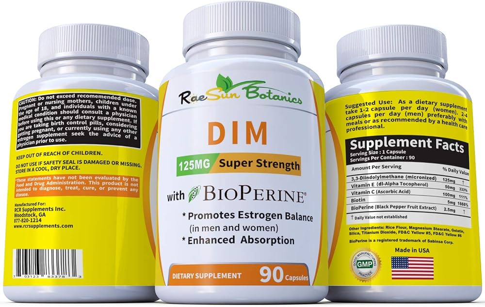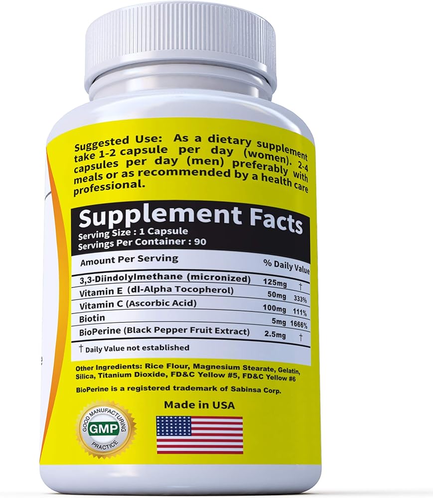 DIM+ Super Strength 125mg is a complex of Vitamins and DIM for a well balance high strength dietary supplement for both Men and Women. DIM (diindolylmethane) is a phytonutrient found in crucifeous vegetables such as broccoli and kale that naturally helps regulate estrogen balance in the body. It is also used as hot flash relief, fertility booster, testosterone support, acne regulation, and PCOS. Also contains Vitamin E, Vitamin C, and Biotin, all which help support healthy skin and nails. BioPerine is a patented form of black pepper extract which enhances the absorption in the small intestine to make the circulating blood levels of DIM increase after ingestion. 125mg is more suited for Women though this product can be taken by both men and women.