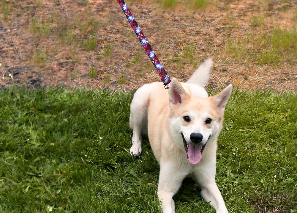 The dog leash is made with picture quality polyester webbing, a material that will not stretch (even when wet) or color-bleed. The doggie leash is also UV resistant and ultra-durable. It can be washed and air dried.