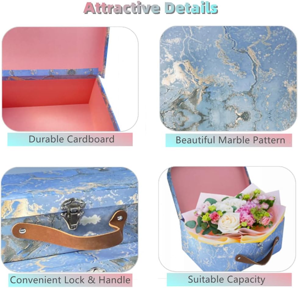 🎁تصميم رخامي رومانسي: صناديق التخزين العصرية مصنوعة من الورق المقوى عالي الجودة بنمط رخامي مذهل ومقبض جلدي ناعم. مزلاج الأمان سهل الفتح والإغلاق، الحافة الناعمة والتصميم المنحني لن يقطع يدك. هذه الحقيبة الأنيقة متينة ويمكن وضعها أو تكديسها أو استخدامها بمفردها.