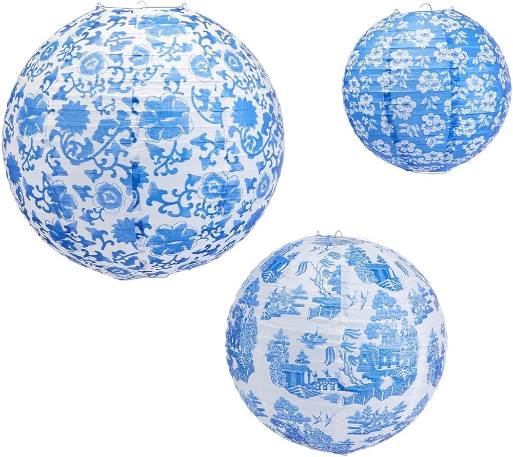 The Two's Company Set of 3 Chinoiserie Paper Lanterns are handmade paper lanterns with included metal wire expander for assembly. Made from recycled materials. For decorative use only. Keep away from flame and direct heat sources. Easy to assemble.