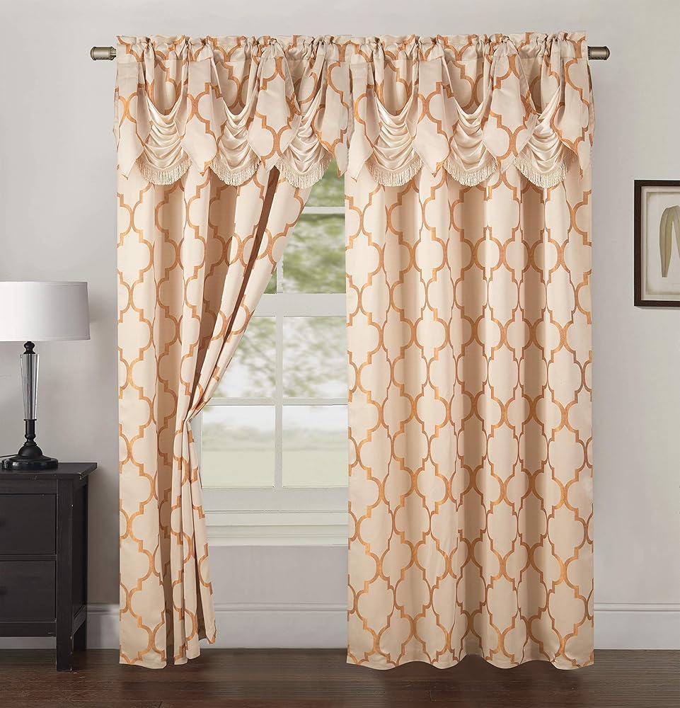 التصميم والبناء - يتضمن لوحين. يبلغ مقاس كل لوح 137 سم عرضًا × 213 سم طولاً مع ستارة قصيرة نمساوية مرفقة 45.7 سم. للحصول على مظهر مثالي، استخدم لوحة واحدة لكل 81.28 سم من النوافذ. تصميم سهل التركيب يتميز بلوحة بنمط جيب القضيب - مادة ثقيلة الوزن: 100% بوليستر