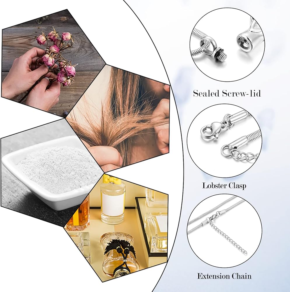 【تذكار لقلادة رماد الجثث】تم تصميم قلادة تذكارية مصنوعة يدويًا للحفاظ على الذكريات تدوم إلى الأبد. قم بتكريم من تحب من خلال الاحتفاظ بكمية صغيرة من الرماد/الشعر/الفراء أو أي شيء ذي معنى ومهم في قلادة تذكارية مصنوعة يدويًا بنسبة 100%.