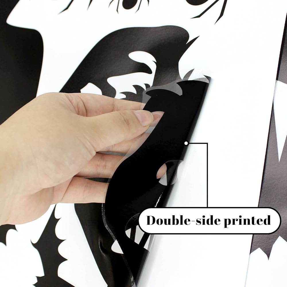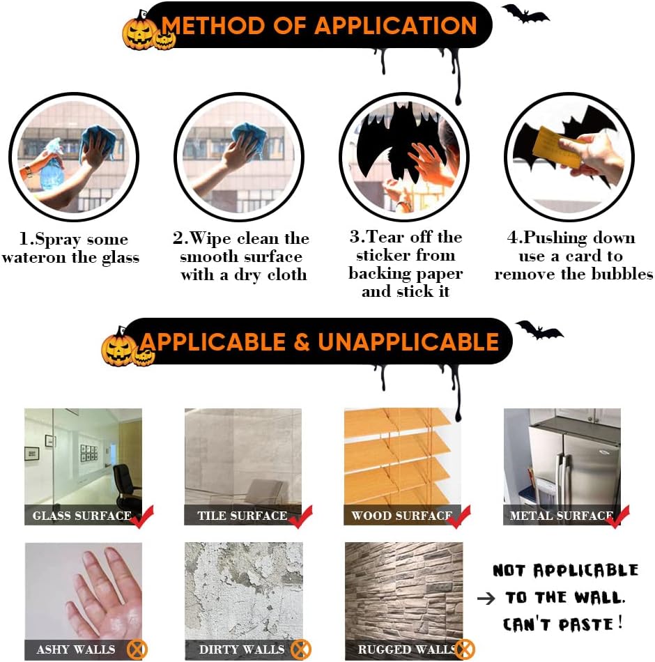 السطح المناسب: استخدم ملصقات نافذة الهالوين هذه على النوافذ، المرايا أو الأبواب، أو الأبواب الزجاجية، أو لوحة نافذة المتجر، أو بلاط السيراميك، أو المقهى أو أي سطح أملس آخر. سطح غير مناسب: ملصقات النوافذ اللاصقة الخاصة بنا للهالووين ليست ملصقات جدارية. لا تستخدم كملصقات جدارية لعيد القديسين، سطح الرماد.