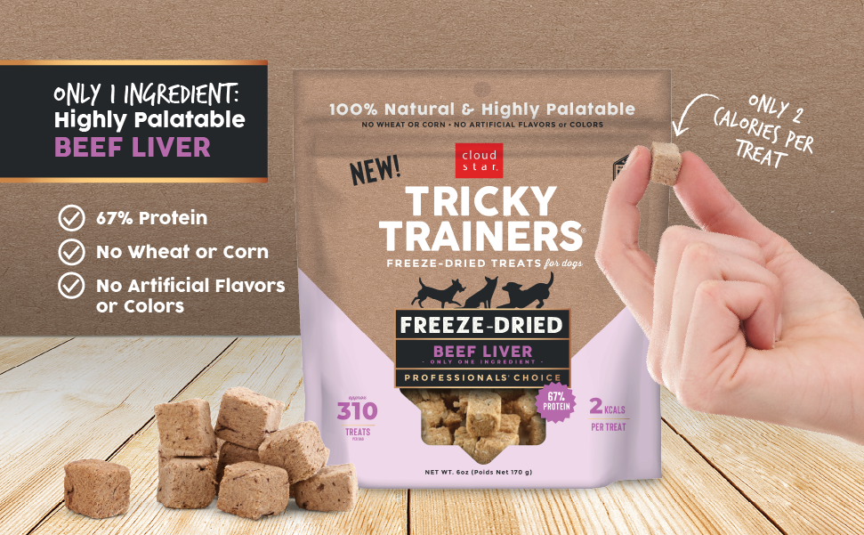 Each Tricky Trainers freeze dried treat is made with only 100% natural beef liver to make for a highly palatable, healthy treat that is packed with protein. With no corn, wheat, artificial colors or flavors, you can feel good about rewarding their good behavior - while training or any time!