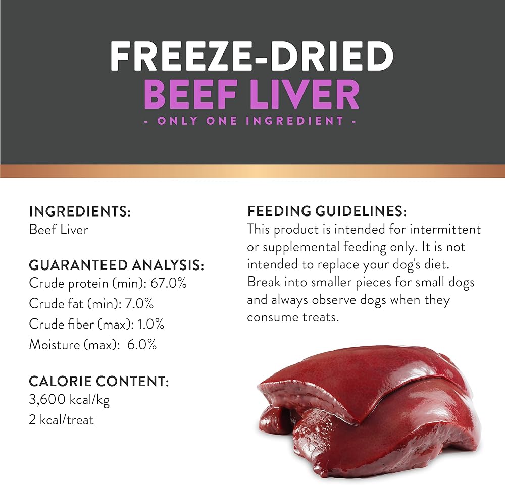 SINGLE INGREDIENT TRAINING TREAT Made with just one ingredient: 100% natural beef liver - freeze dried to lock in flavor and nutrients! Great for all breeds and life stages, even your puppy!