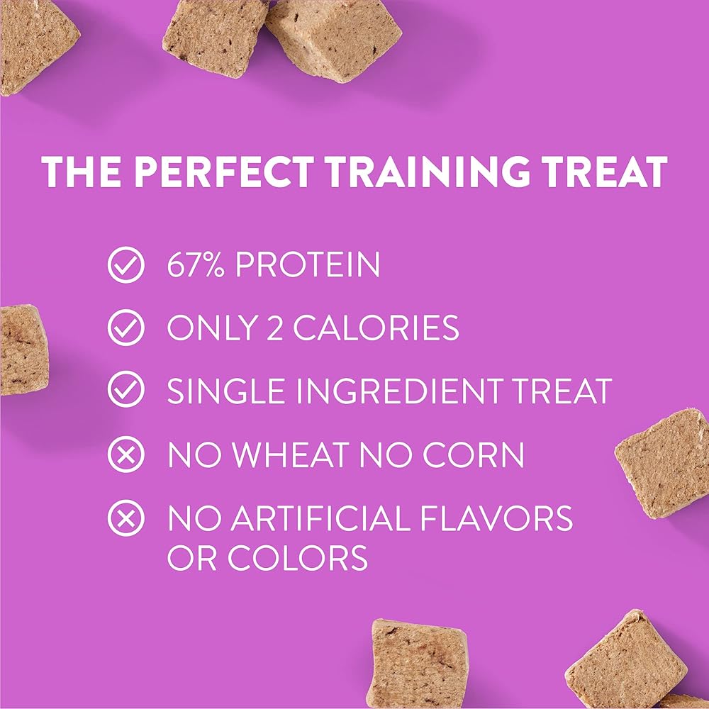 LOW CALORIE & HIGH PROTEIN With only 2 calories per treat and 67% protein, these small treats won't fill them up or cause weight gain. Perfect for long training sessions with 155 treats per bag!