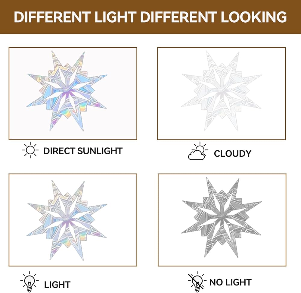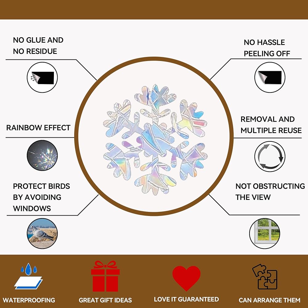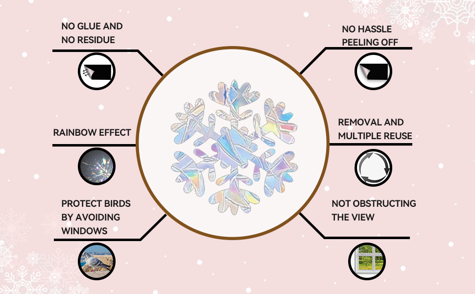 ❄️ انقذ الطيور - مع ملصقات النوافذ بنمط ندفة الثلج للكريسماس، يمكنك حماية الطيور بشكل جيد للغاية. تعكس ملصقات النوافذ الزجاجية بنمط ندفة الثلج للكريسماس ضوء الشمس الذي تأخذه الطيور كتنبيهات، وتمنع الطيور من ضرب الأبواب والنوافذ الزجاجية المنزلقة.
