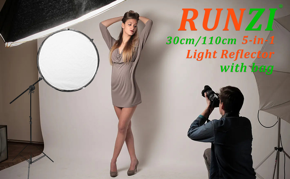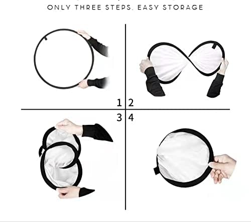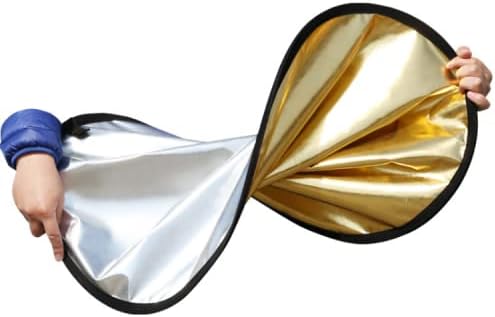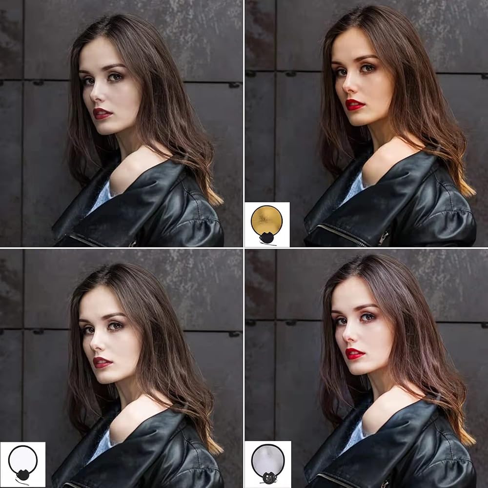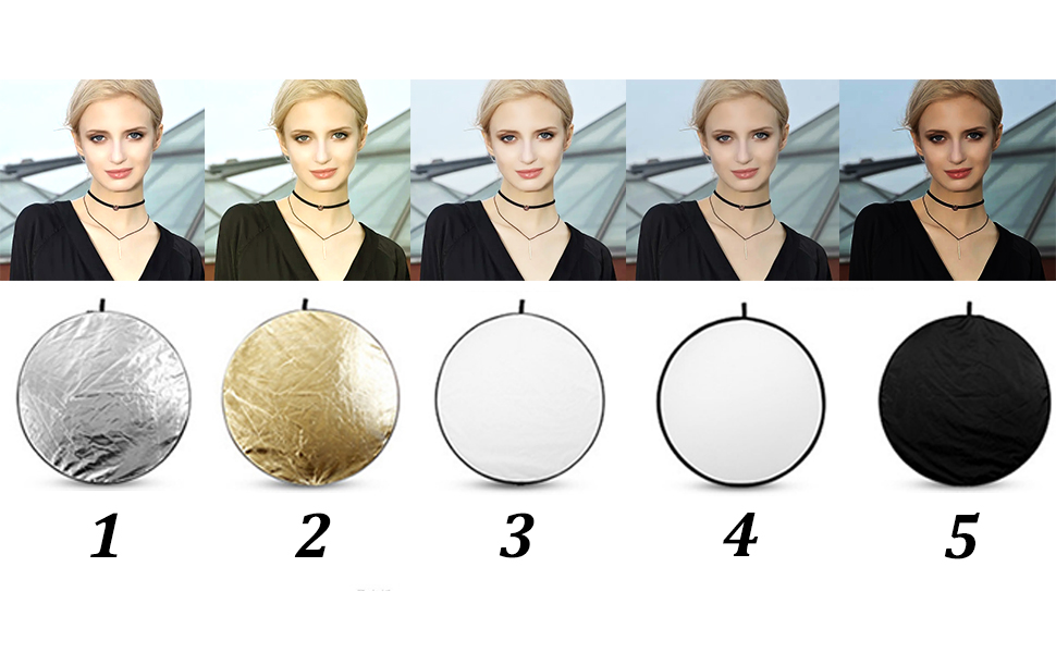 5 في 1 عاكس مع الفضة والذهب والأسود والأبيض والشفاف. الذهب: صورة دافئة؛ الفضة: تضيء الصورة؛ الأبيض: يعكس الضوء إلى الظلال. أسود: يحجب الضوء غير الضروري؛ شفاف: مظهر أكثر نعومة بدون ظل