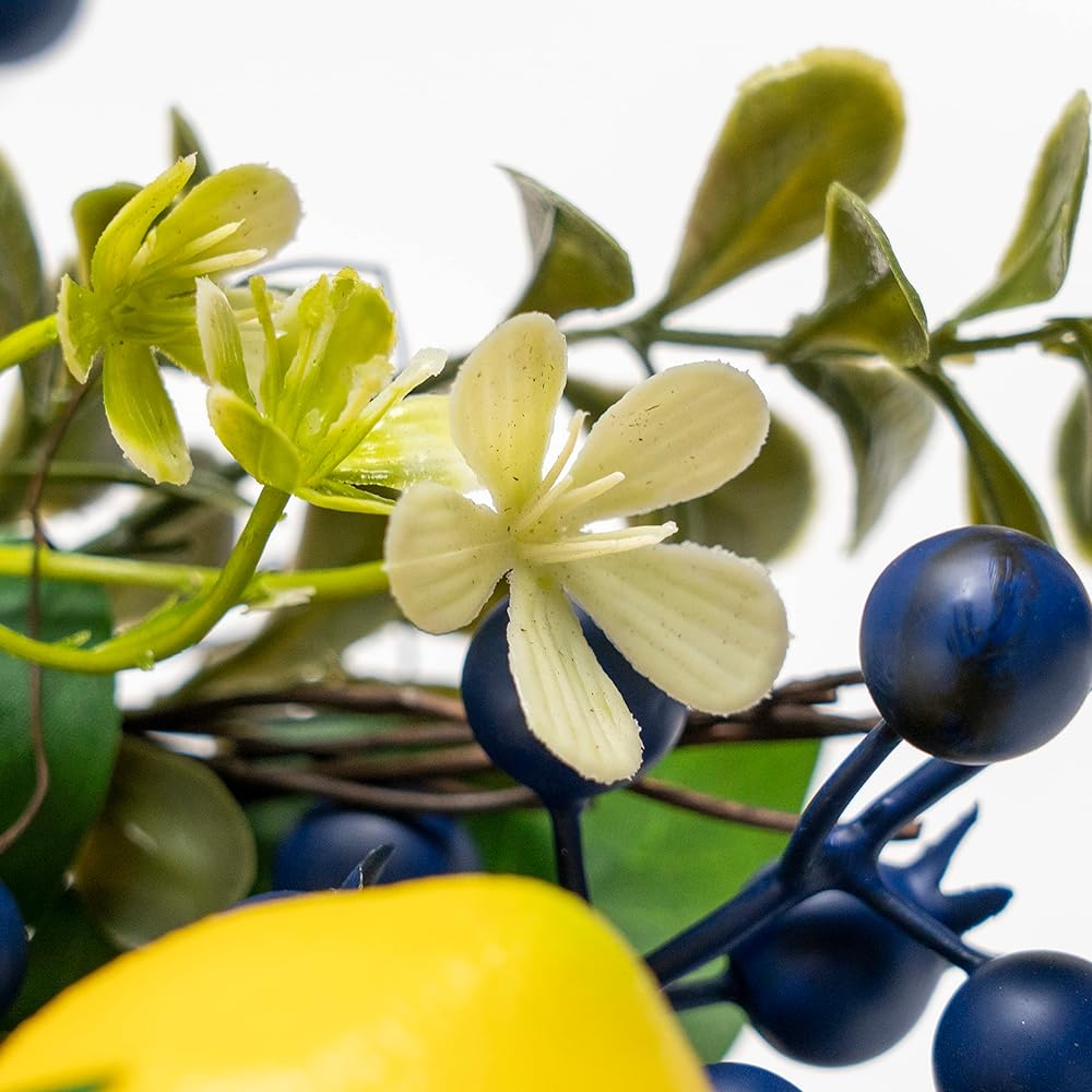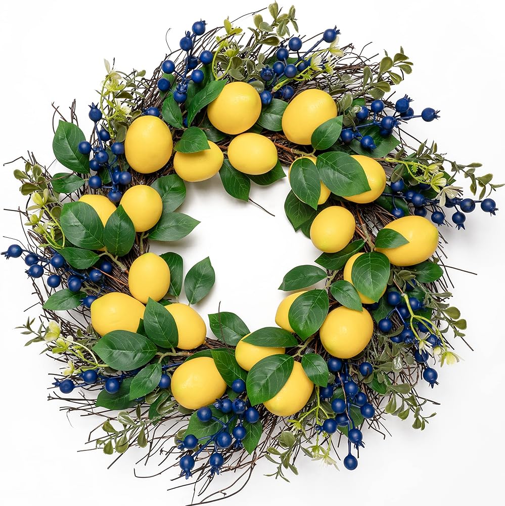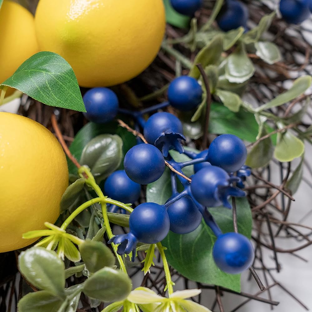 الاستخدامات: يستخدم إكليل الليمون الأصفر والتوت الأزرق والأوراق الخضراء لتزيين الباب الأمامي كإكليل صيفي وخريفي، مما يخلق جوًا دافئًا وأنيقًا.