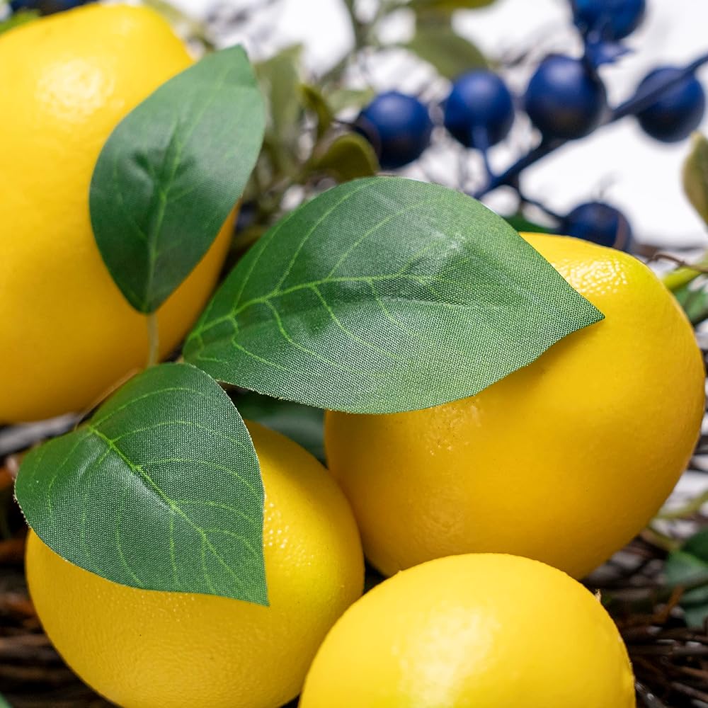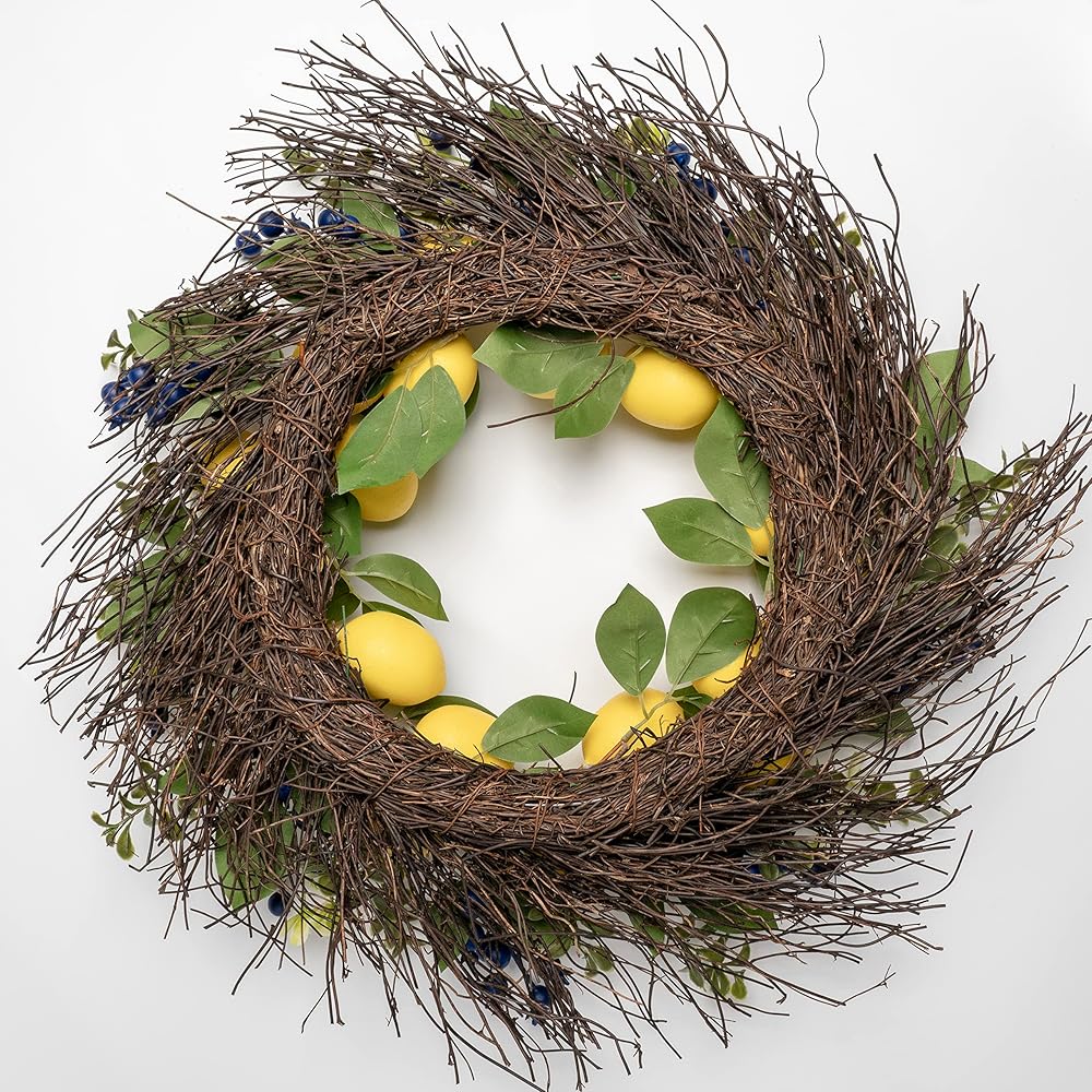 المواد: الليمون الأصفر والتوت الأزرق والأوراق الخضراء لهذا الإكليل الجميل من البلاستيك، والقاعدة منسوجة من الأغصان البنية.