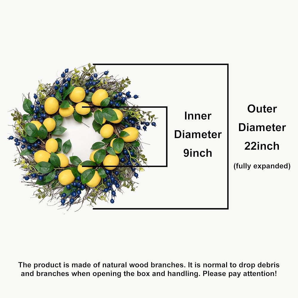 *يبلغ قطر إكليل التوت الأزرق والليمون الأصفر هذا مع أوراق خضراء (بعد توسيع الأوراق بالكامل) حوالي 22 انش ويأتي مع قاعدة أسلاك حديدية منسوجة. يرجى التحقق من الصورة لمعرفة المقاس والتفاصيل.