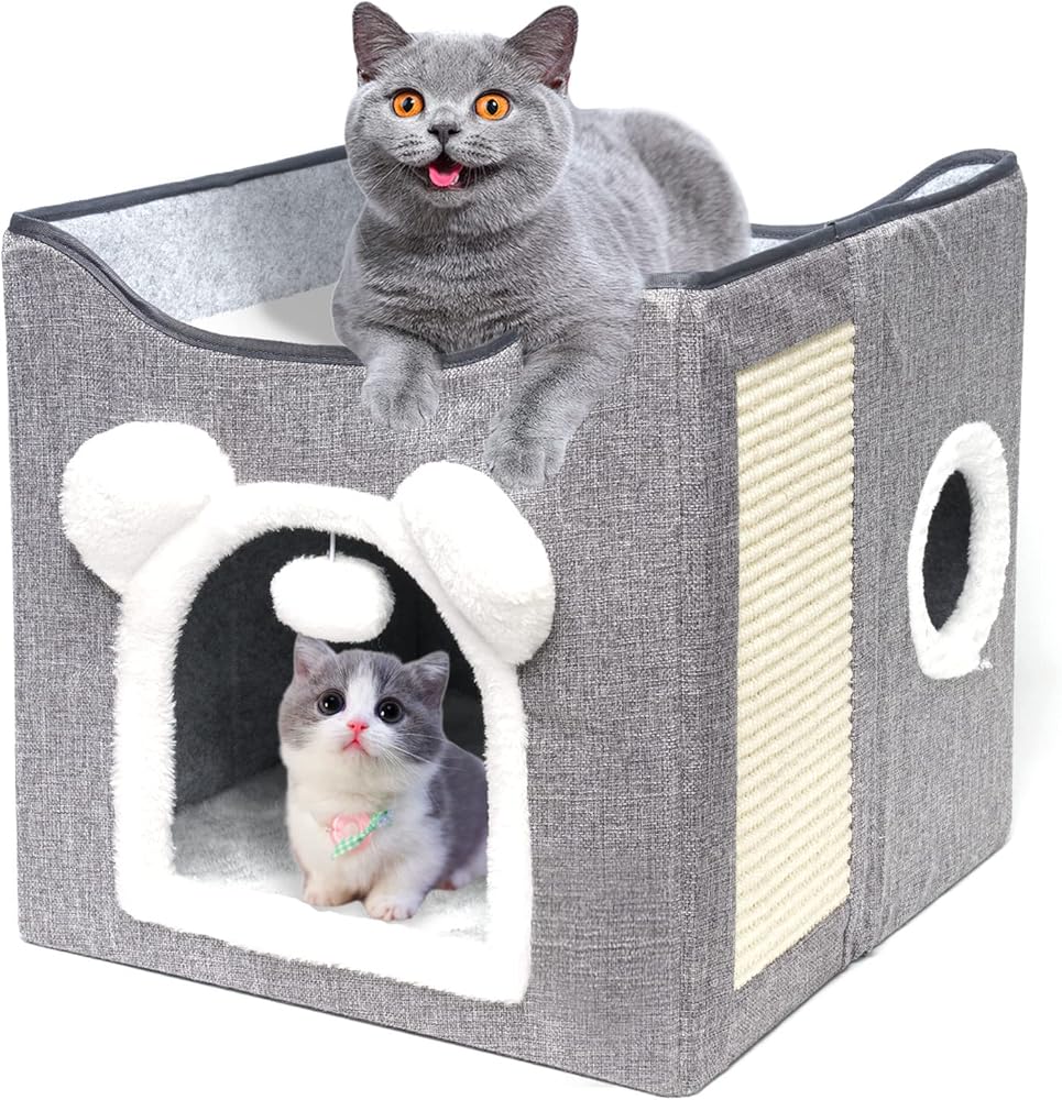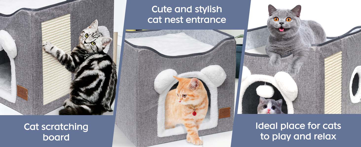 هيكل ثابت وسميك: بيت القطط مصنوع من لوح MDF خفيف وقوي، ويحتوي على لوحة سفلية سميكة، مما يسمح لقطتك بالسقوط بثبات على بيت القطط عندما يكون حرًا في القفز واللعب. يمكن أن يحمل كهف القطط هذا ما يصل إلى 40 رطلاً.