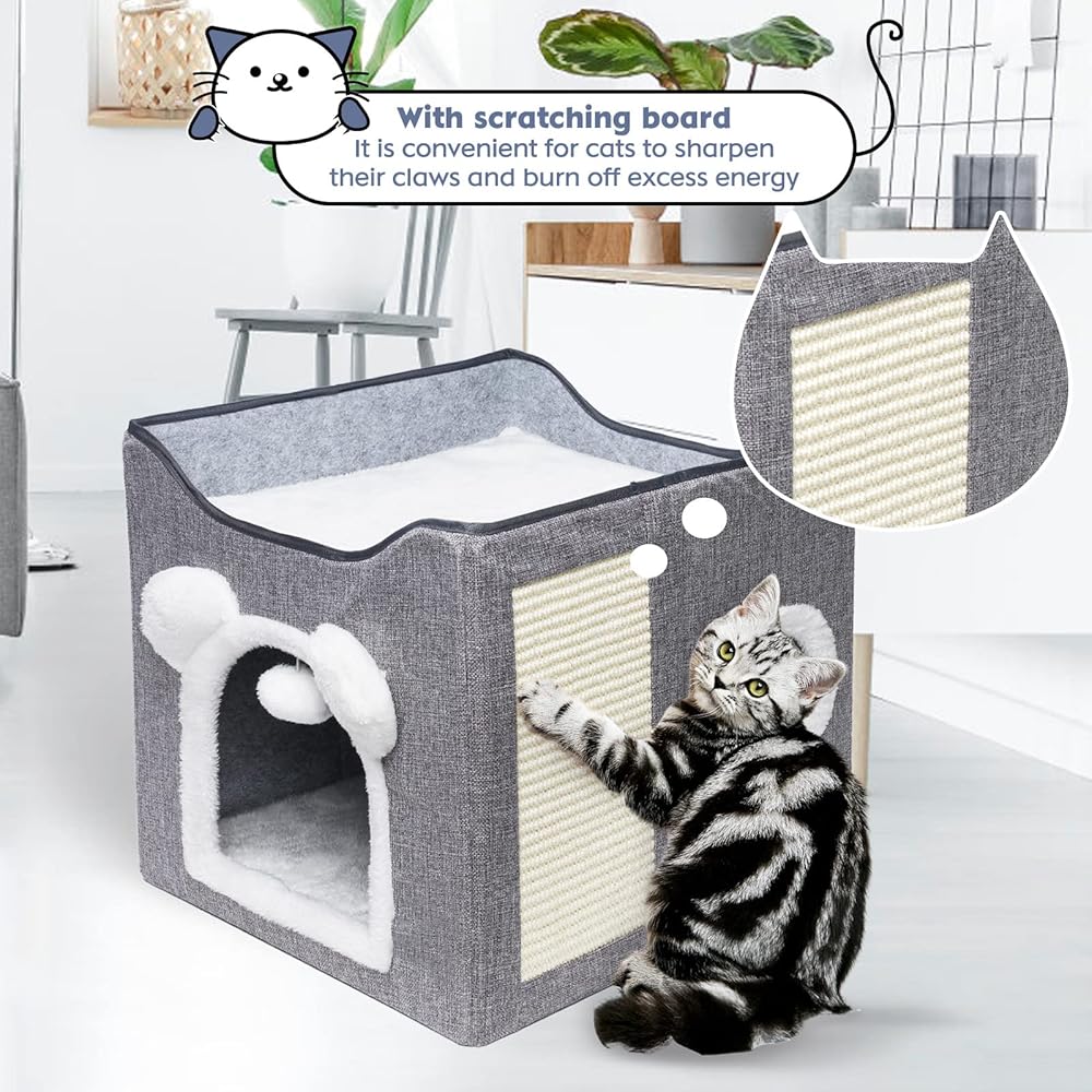 لوح خدش متين: سرير القطط مجهز بلوح خدش من السيزال على الجانب المختبئ للقطط، وهو قوي ومتين، مما يسمح للقطط بشحذ مخالبها عندما تشعر بالملل وتجنب خدش الأثاث والضروريات اليومية.