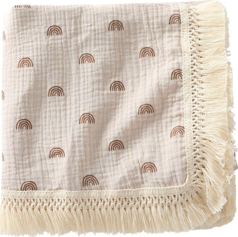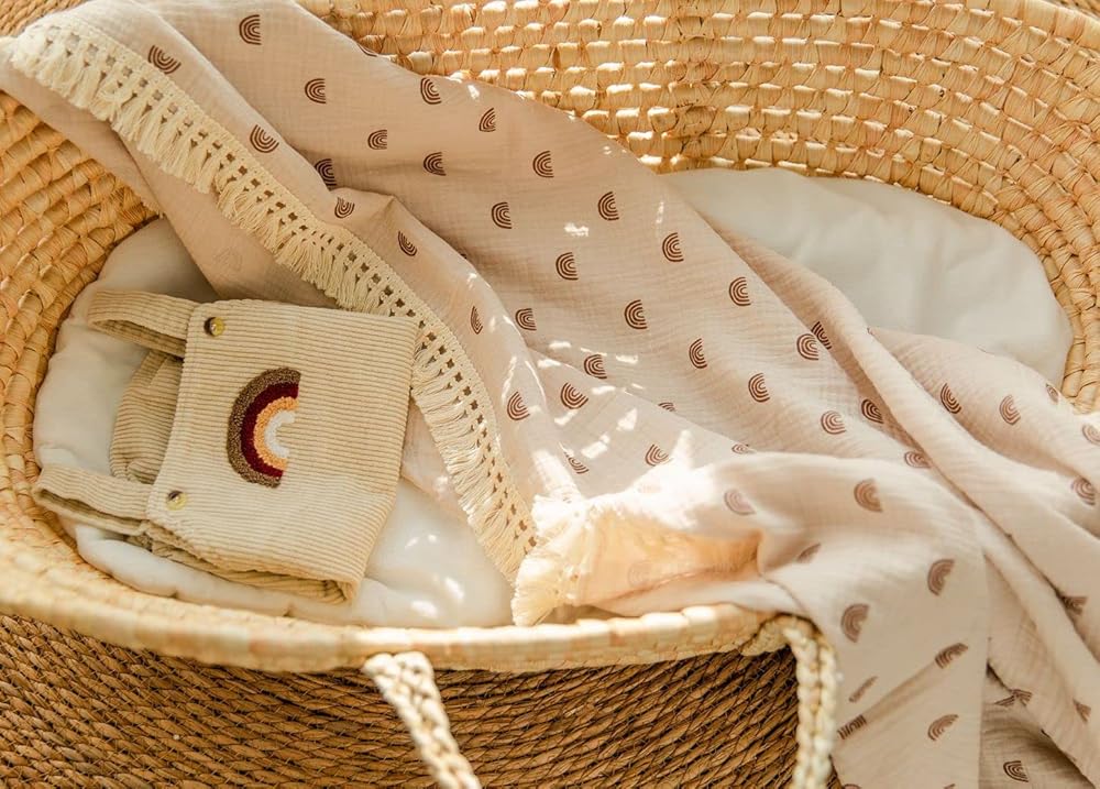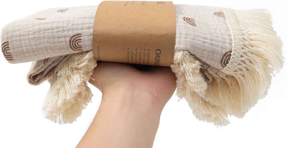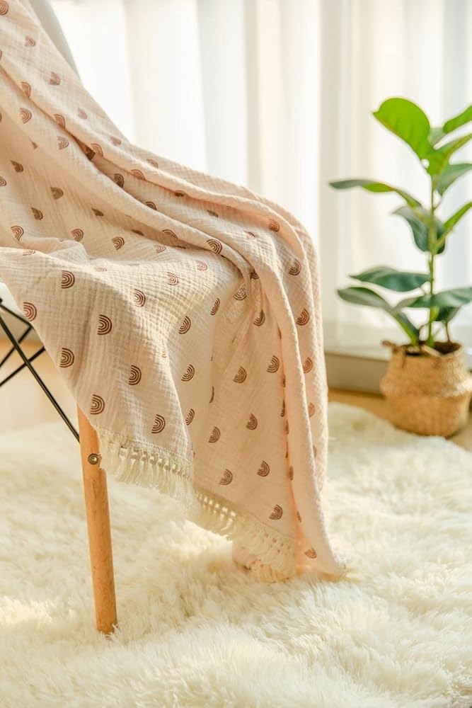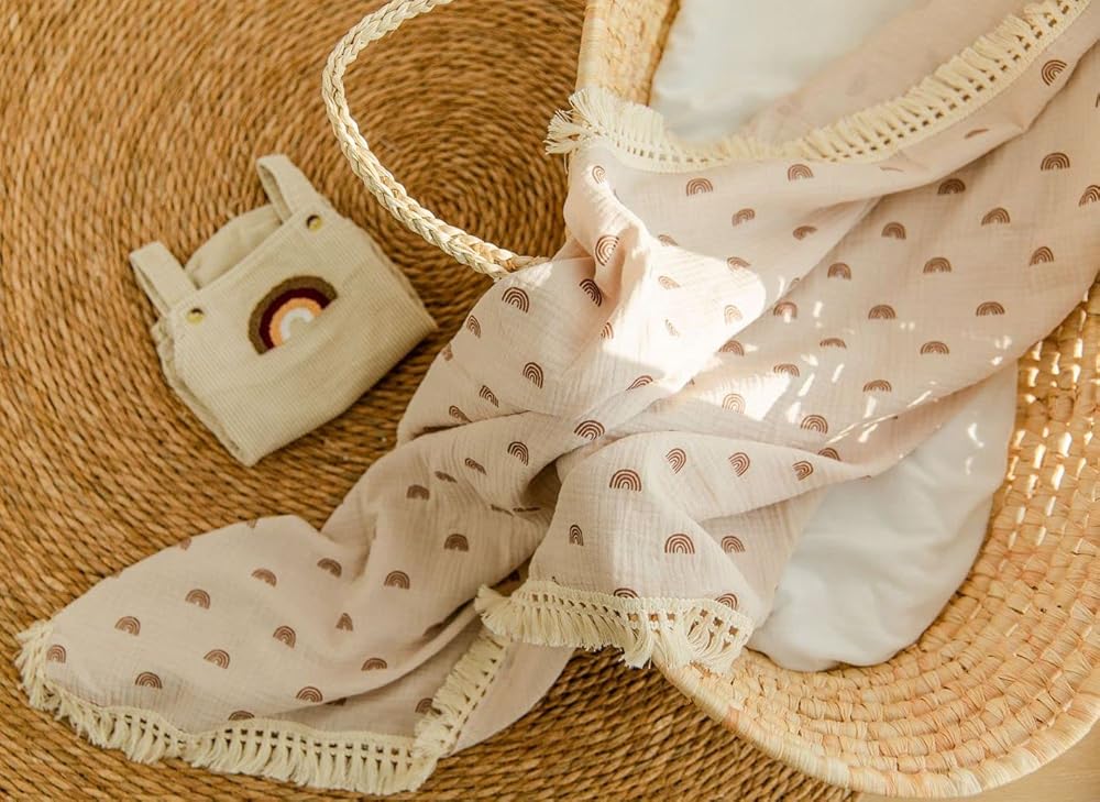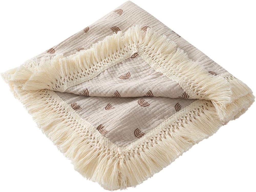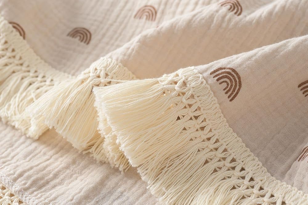 بطانيات الموسلين ذات الشراشيب الخاصة بنا مصنوعة من قماش الشاش المزدوج القطني بنسبة 100%، وهي ناعمة وذات ملمس مجعد، مما يضمن أن هذه البطانية جيدة التهوية وناعمة وخفيفة الوزن. يستمر في الحصول على نعومة أكبر مع كل غسلة.