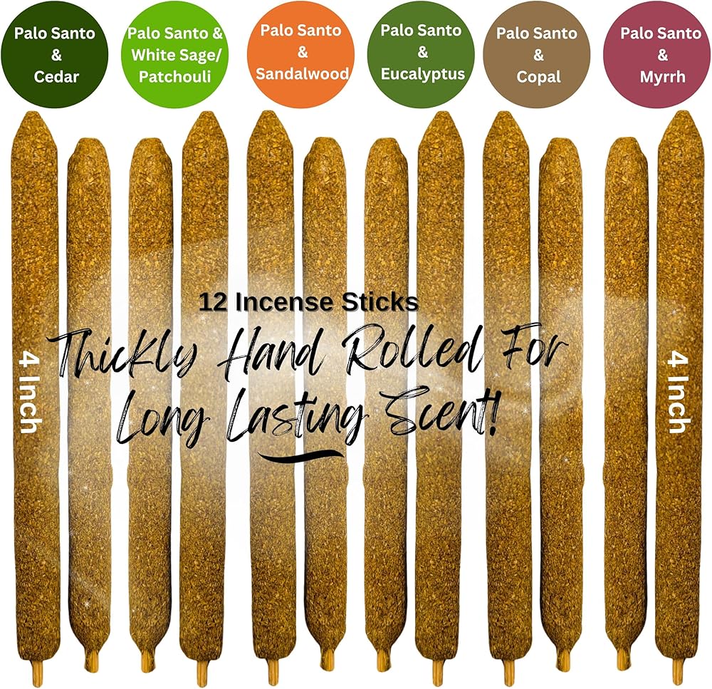 مجموعة متنوعة من البخور الملفوف يدويًا من بالو سانتو - مصنوعة بحرفية، كل عصا مقاس 10.16 سم تم صنعها بعناية من بالو سانتو النقي والمستدام وتتضمن 6 روائح و12 عصا إجمالية. تشتمل أعواد البخور المتنوعة السميكة هذه على: 1. بالو سانتو وخشب الصندل، 2. بالو سانتو وكوبال، 3. بالو سانتو والمر، 4. بالو سانتو والأوكالبتوس، 5. بالو سانتو والأرز، 6. بالو سانتو والمريمية البيضاء/الباتشولي (مزيج التنقية).