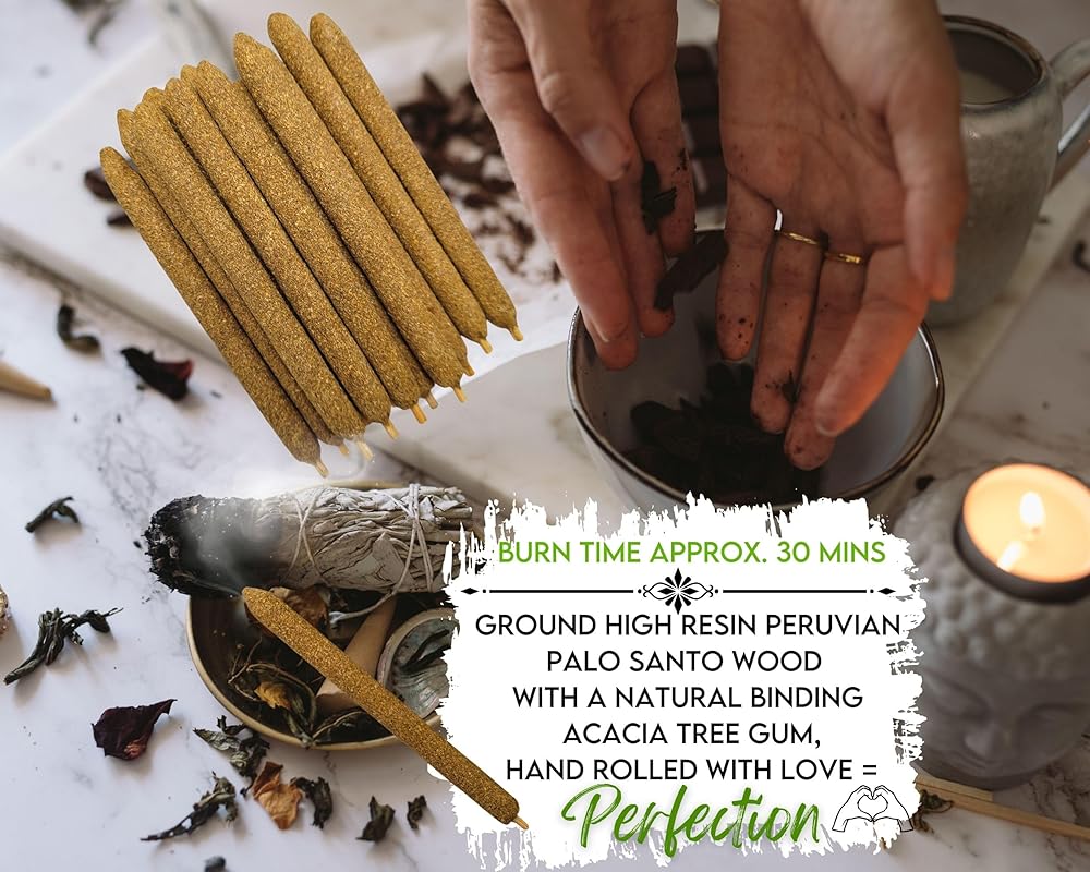 مكونات طبيعية بالكامل - أعواد البخور الخاصة بنا مصنوعة من خشب بالو سانتو المطحون عالي الراتنج والمتماسك مع صمغ شجرة السنط وغني بالأعشاب الأرضية المختلفة كما هو موضح أعلاه. البخور الخاص بنا خالي من الشوائب ومن النباتات المزروعة عضويًا.