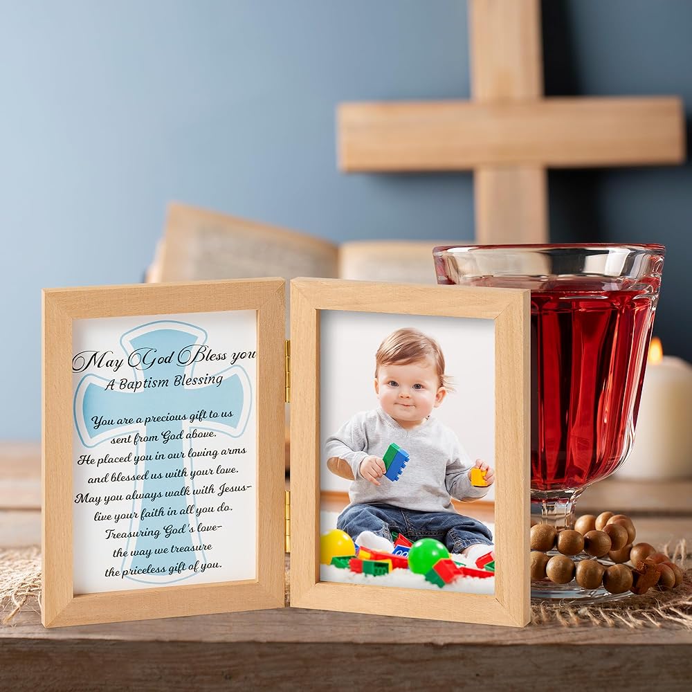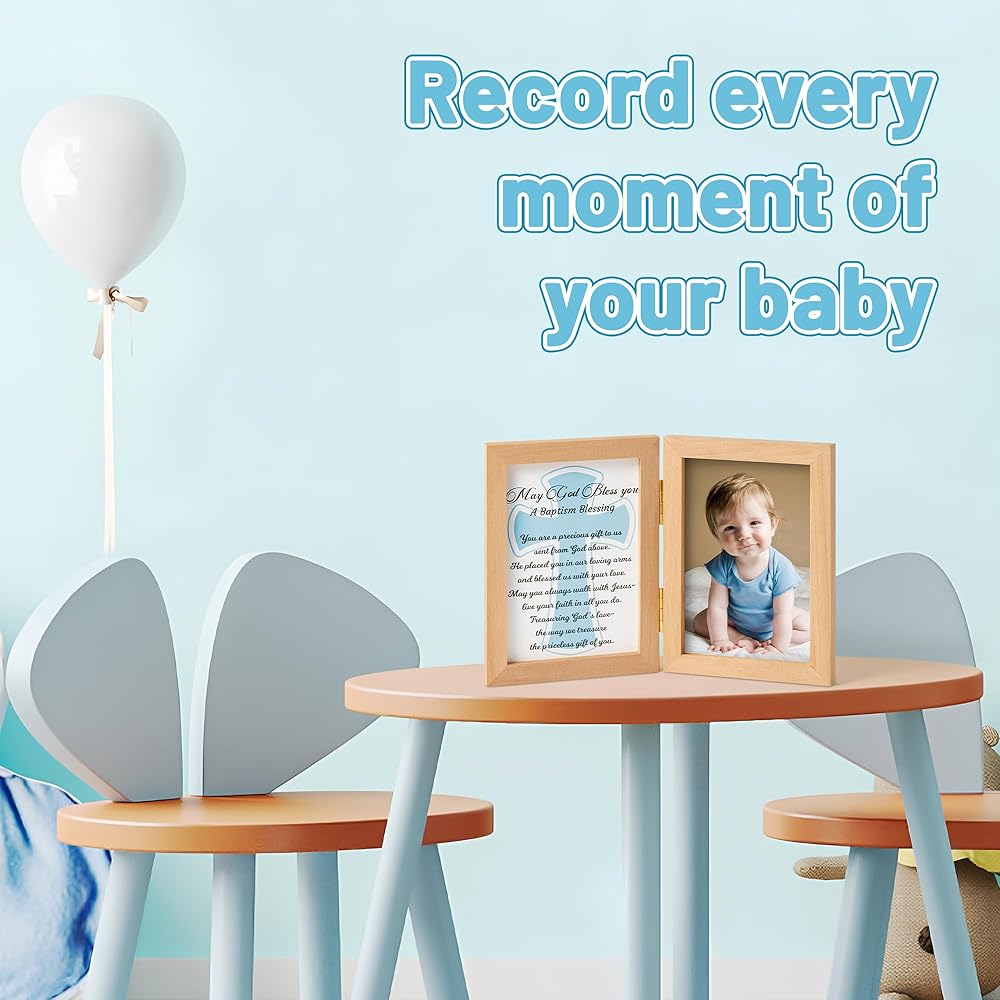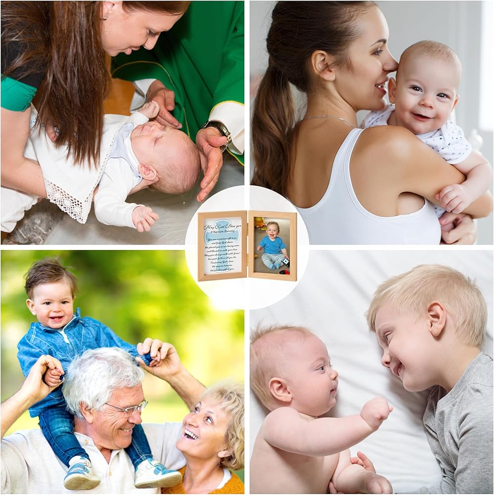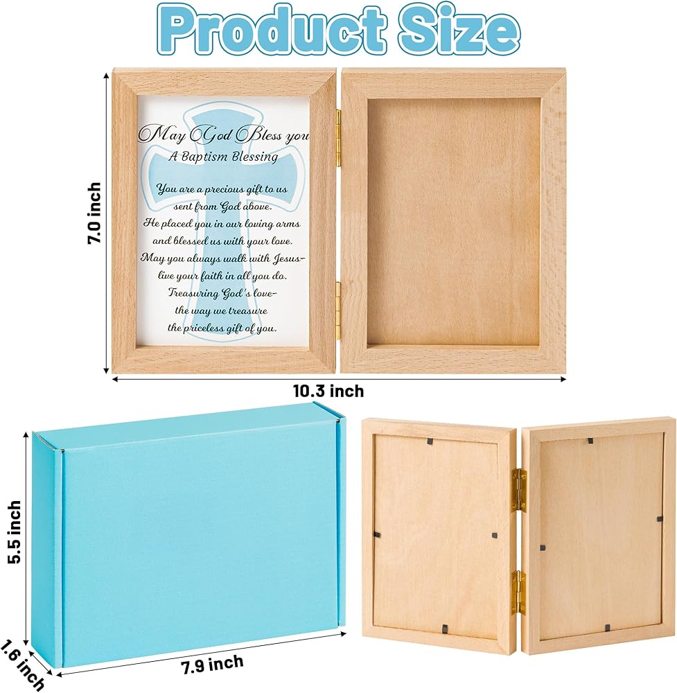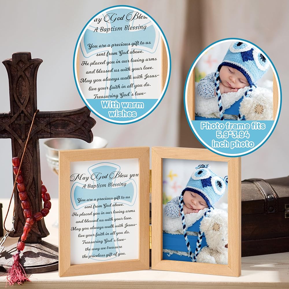 تصميم إطار مزدوج: يتميز هذا الإطار بتصميم إطار مزدوج فريد مصمم لالتقاط جوهر حفل التعميد. يتم تثبيت الإطارين من خشب الزان معًا بشكل آمن بواسطة مشبكين معدنيين في المنتصف. يتيح لك هذا التصميم عرض صورة ثمينة لطفلك مقاس 5.9*3.93 بوصة على أحد الجانبين وصليب أزرق دافئ وبطاقة مباركة بحروف سوداء على الجانب الآخر.