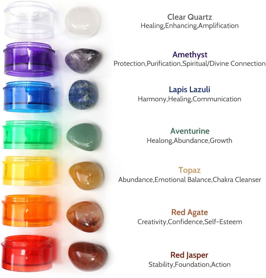 • 7 Chakras Balancing with Amethyst , Aventurine, Clear Quartz, Lapis Lazuli , Red Jasper, Red Agate , and Topaz. This super value set includes 7 Natural Gemstones selected for their individual properties and alignment to the 7 Chakras.