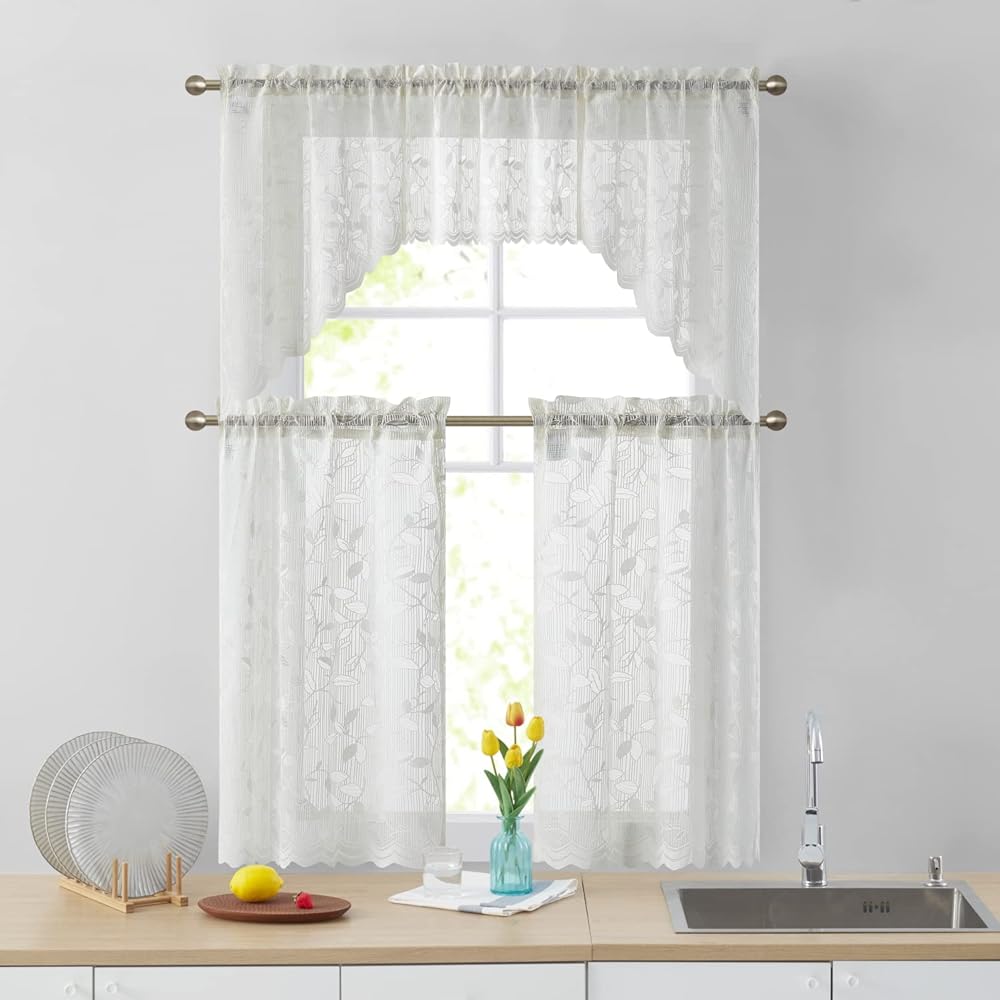 • Sheer lace window treatments look great in any style of home, be it traditional or modern, offering a lightweight airy feeling that softens the ambience of your kitchen, bathroom or basement windows.