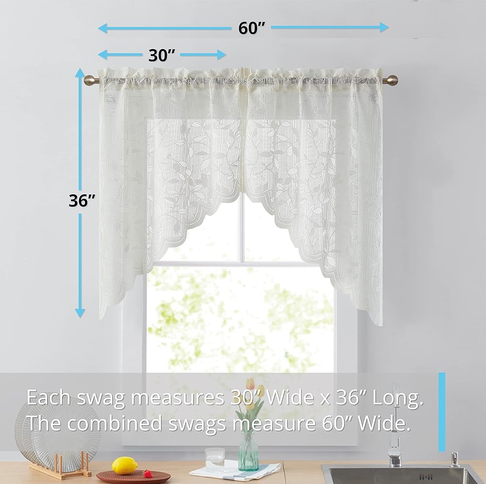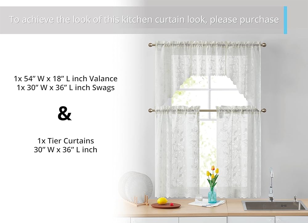 • To complete a full kitchen curtain set as shown in our photos, you will need to purchase one (1) tier set according to your window size + one (1) swag set + one (1) valance measuring 18" inch long. Please note swags and tiers are sold separately.