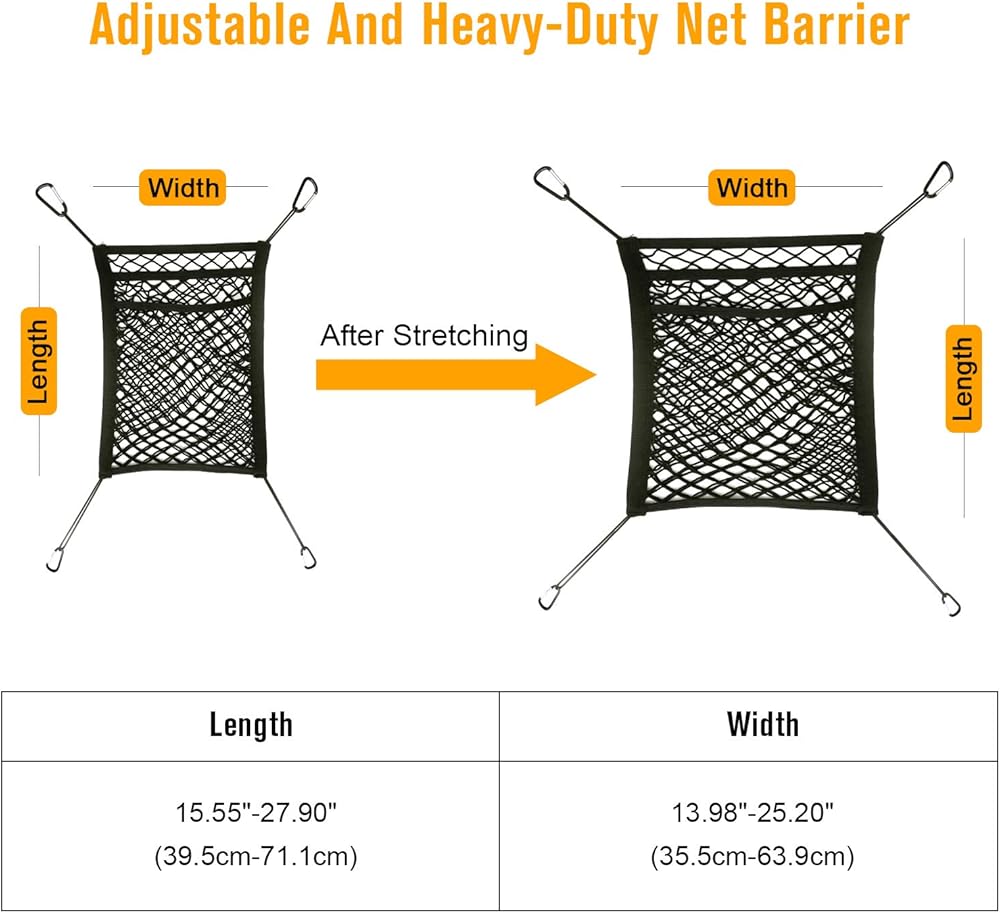 مرونة قوية وقابلية للتعديل بالكامل: بفضل مرونته العالية والمرونة القوية، يمكن تخصيص الحاجز بسهولة في العرض والارتفاع ليناسب منطقة المقعد الخلفي. يمكن تمديده إلى الطول الكامل 27.9 بوصة والعرض 25.2 بوصة. يمكن تعديلها بسهولة وهي كبيرة بما يكفي لتناسب معظم سيارات الدفع الرباعي والشاحنات وسيارات الجيب والهاتشباك. مريحة للإزالة والتخزين السريع