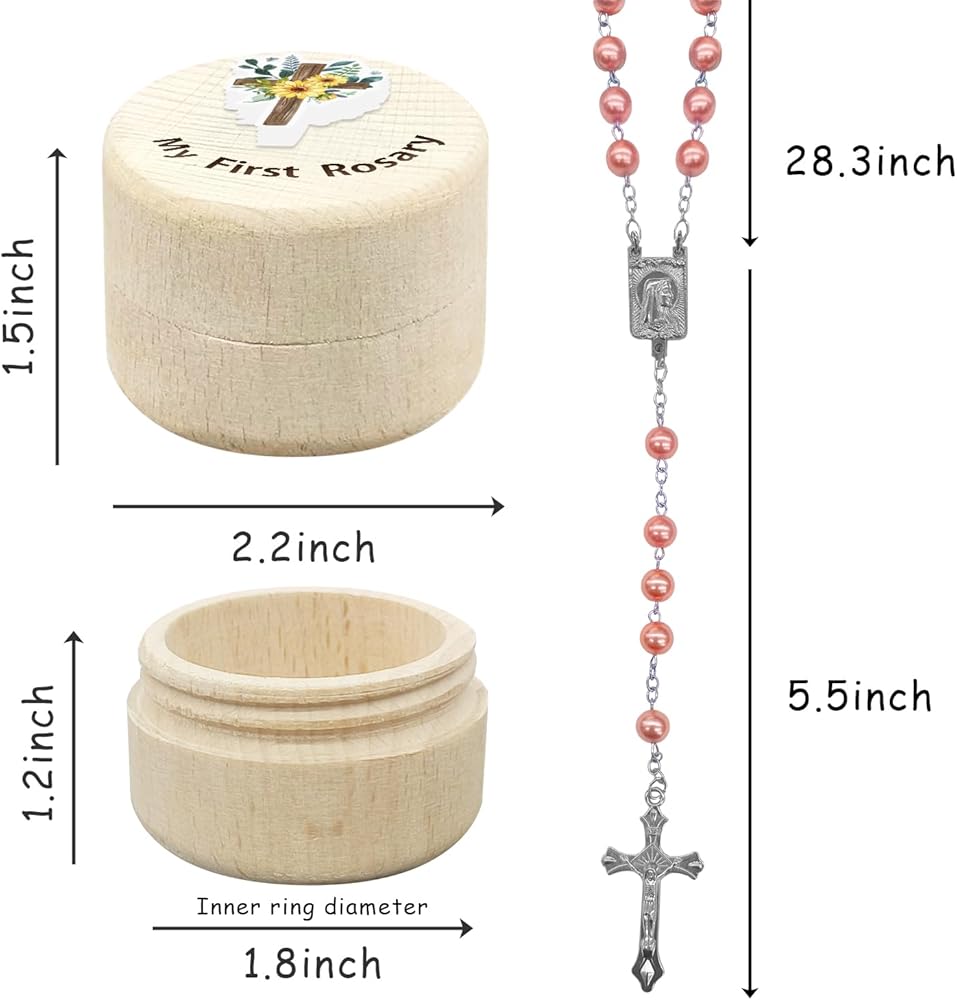 • 【About Baby Baptism Set】Rosary beads catholic gift comes with a delicate wooden box, its size is 1.57*1.57*2.2inch. The length of the rosary is about 33.46inch, and the diameter of each bead is: 0.31inch, you put the rosary in it, and put it in your pocket to pray anywhere.
