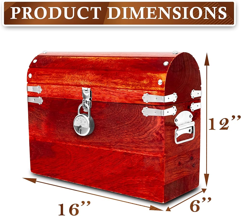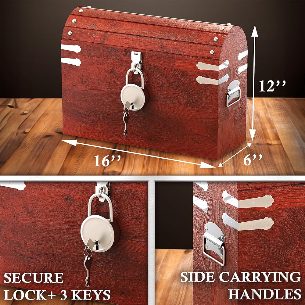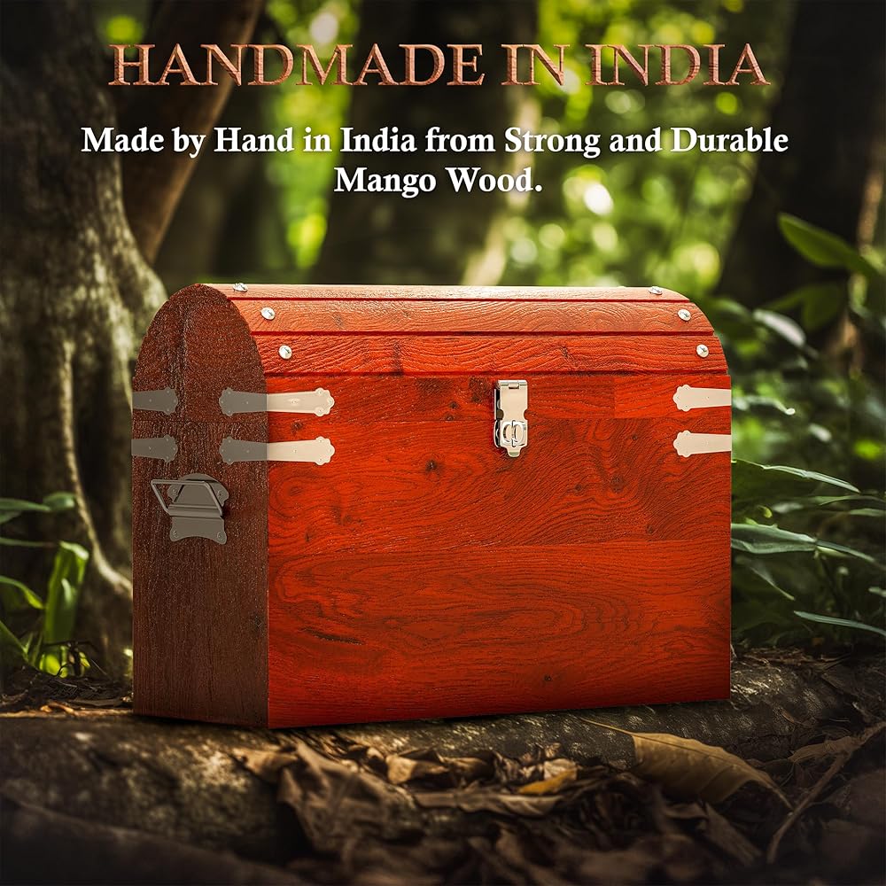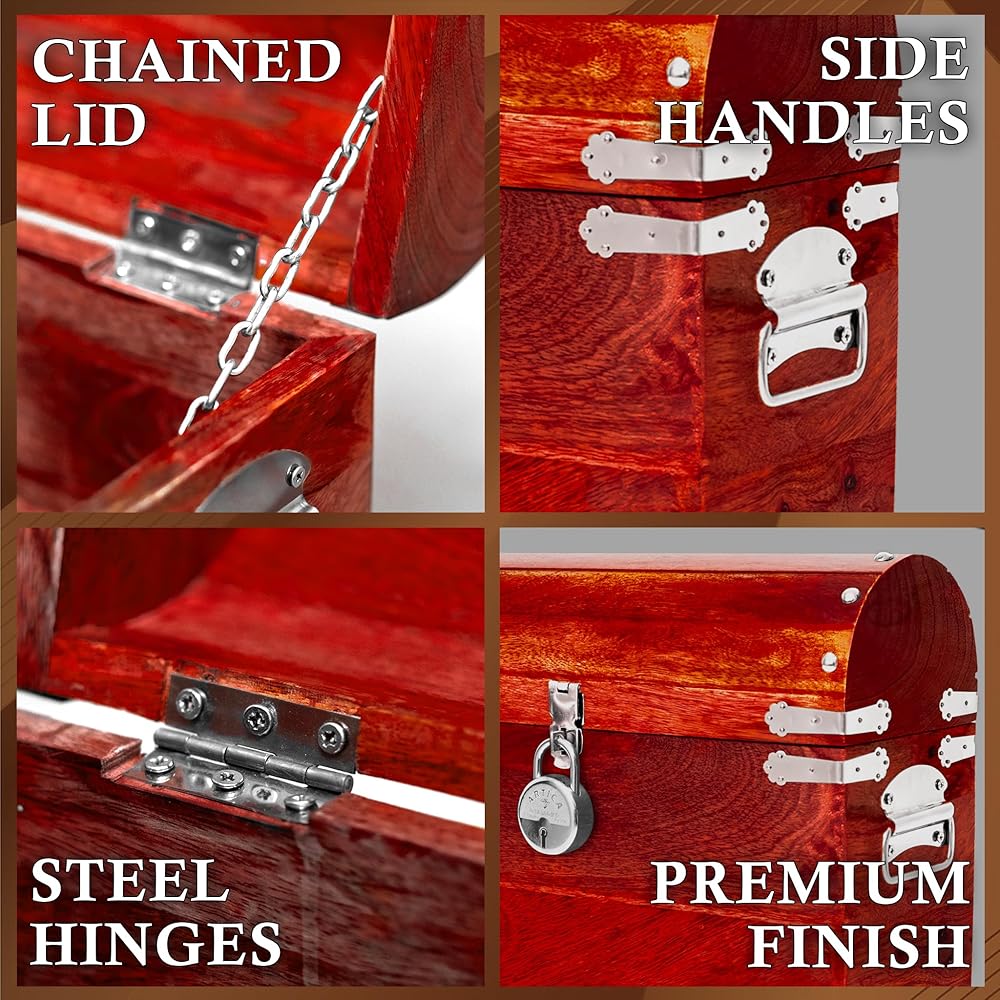 يأتي صندوق كنز القرصان الكبير هذا مزودًا بمفصلات معدنية، وألواح، ومقابض، وقفل، وسلسلة، مما يجعل صندوق صندوق القراصنة الخشبي العتيق الخاص بنا ملفتًا للنظر حقًا