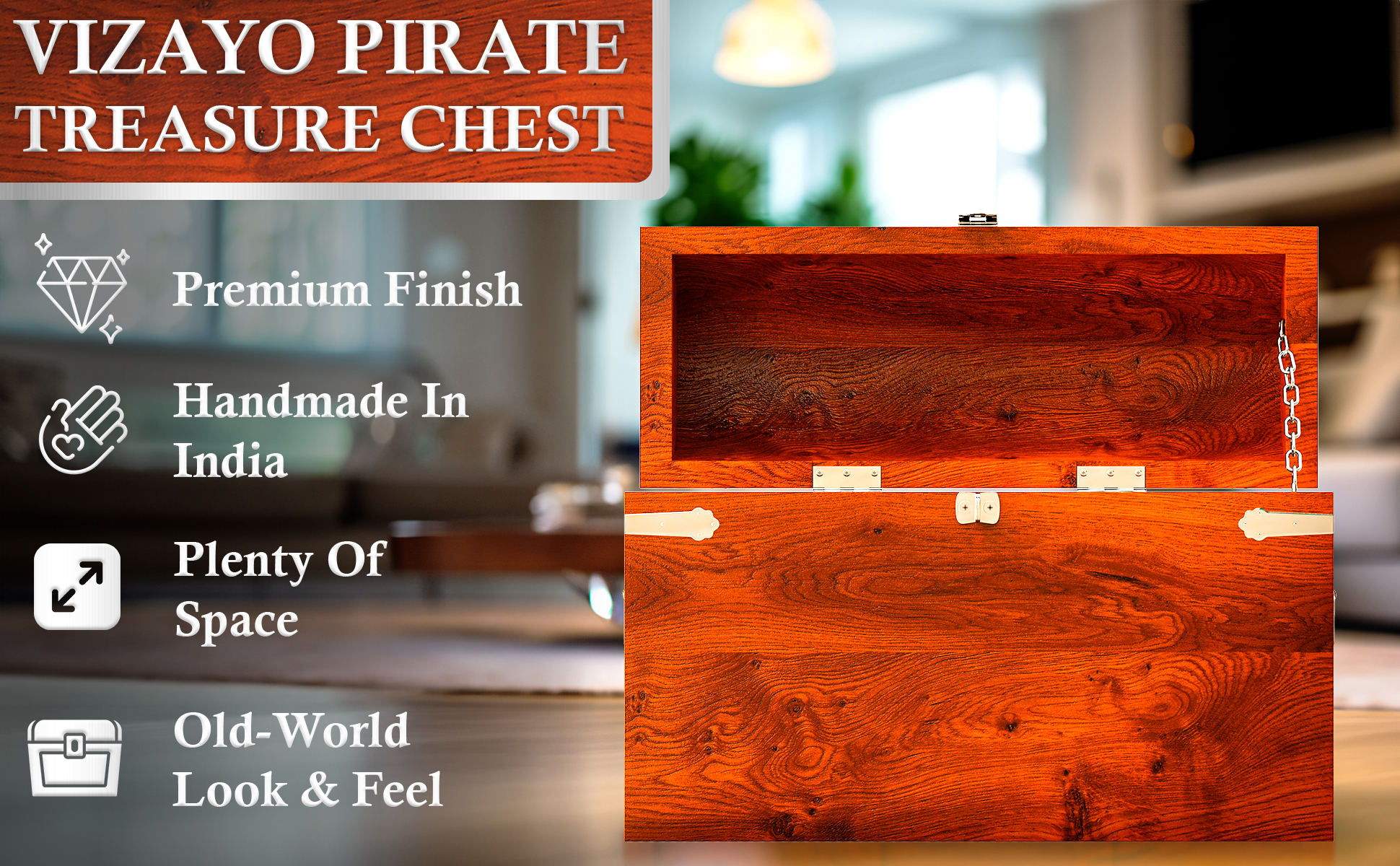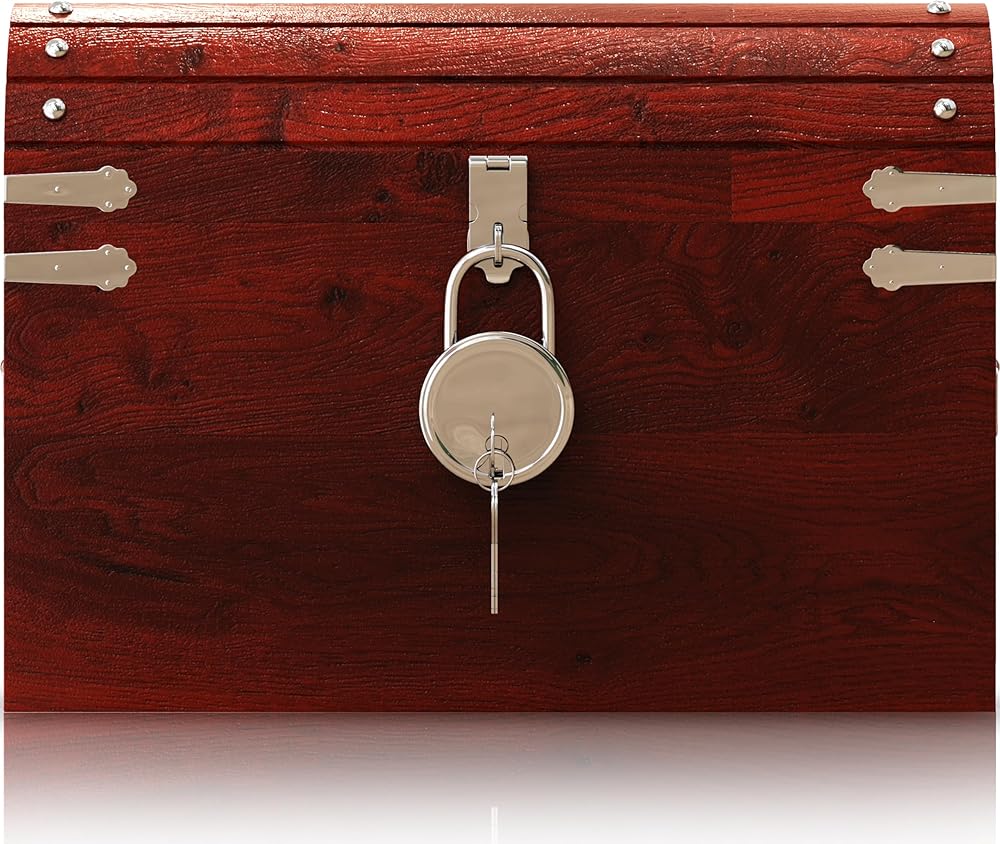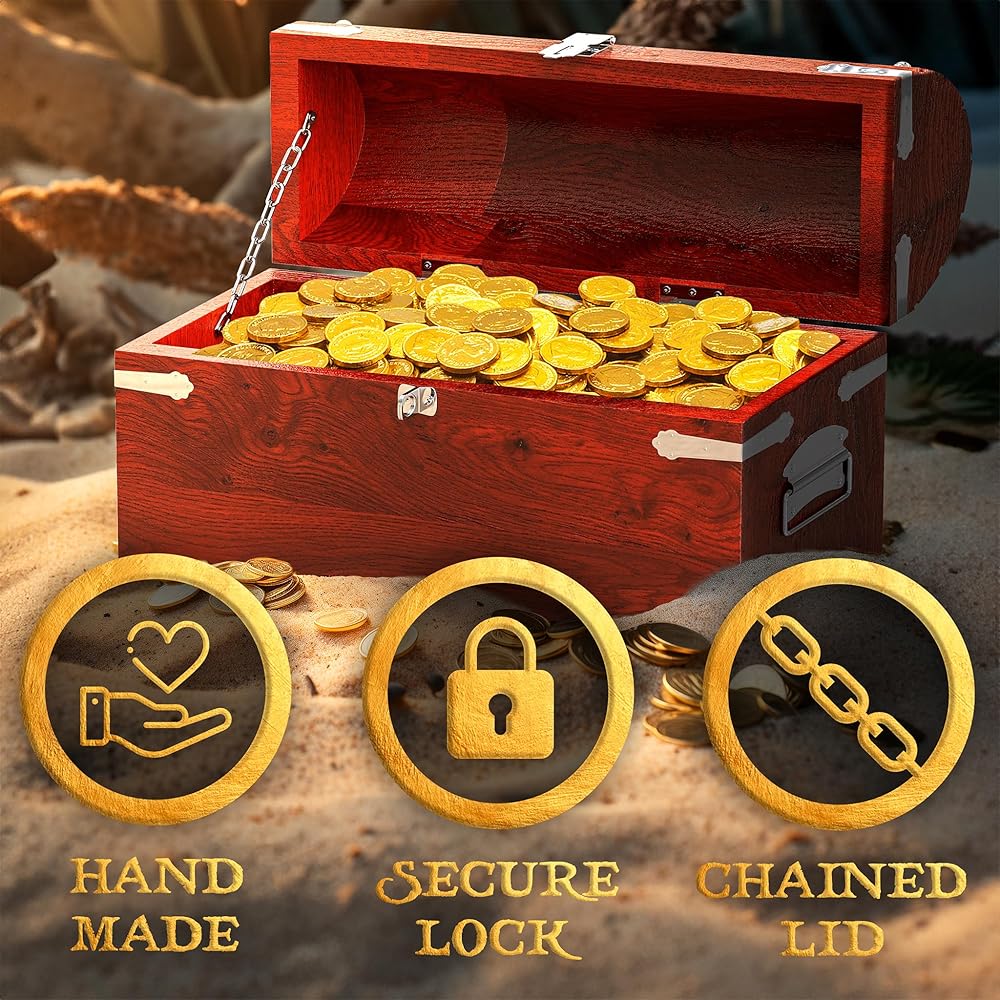 يأتي صندوق كنز القرصان الكبير هذا مزودًا بمفصلات معدنية، وألواح، ومقابض، وقفل، وسلسلة، مما يجعل صندوق صندوق القراصنة الخشبي العتيق الخاص بنا ملفتًا للنظر حقًا