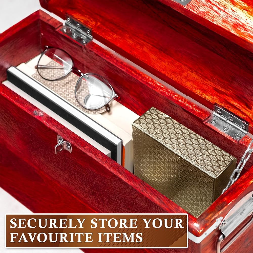 للحفاظ على المحتوى آمنًا وآمنًا، سيحافظ صندوق الصدر الخشبي الخاص بنا على حمايته؛ يأتي هذا الصندوق الخشبي المزخرف المزود بقفل بقفل معدني صلب ومفتاحين لضمان عدم فقدان متعلقاتك أبدًا