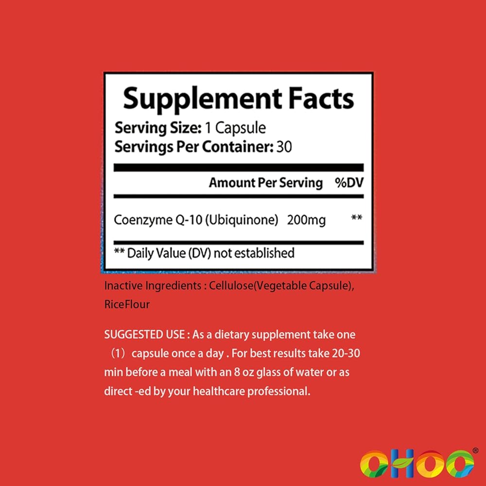 OHOO 200 مجم CoQ10، دعم الإنزيم المساعد Q10 لمكملات الطاقة، 30 كبسولة