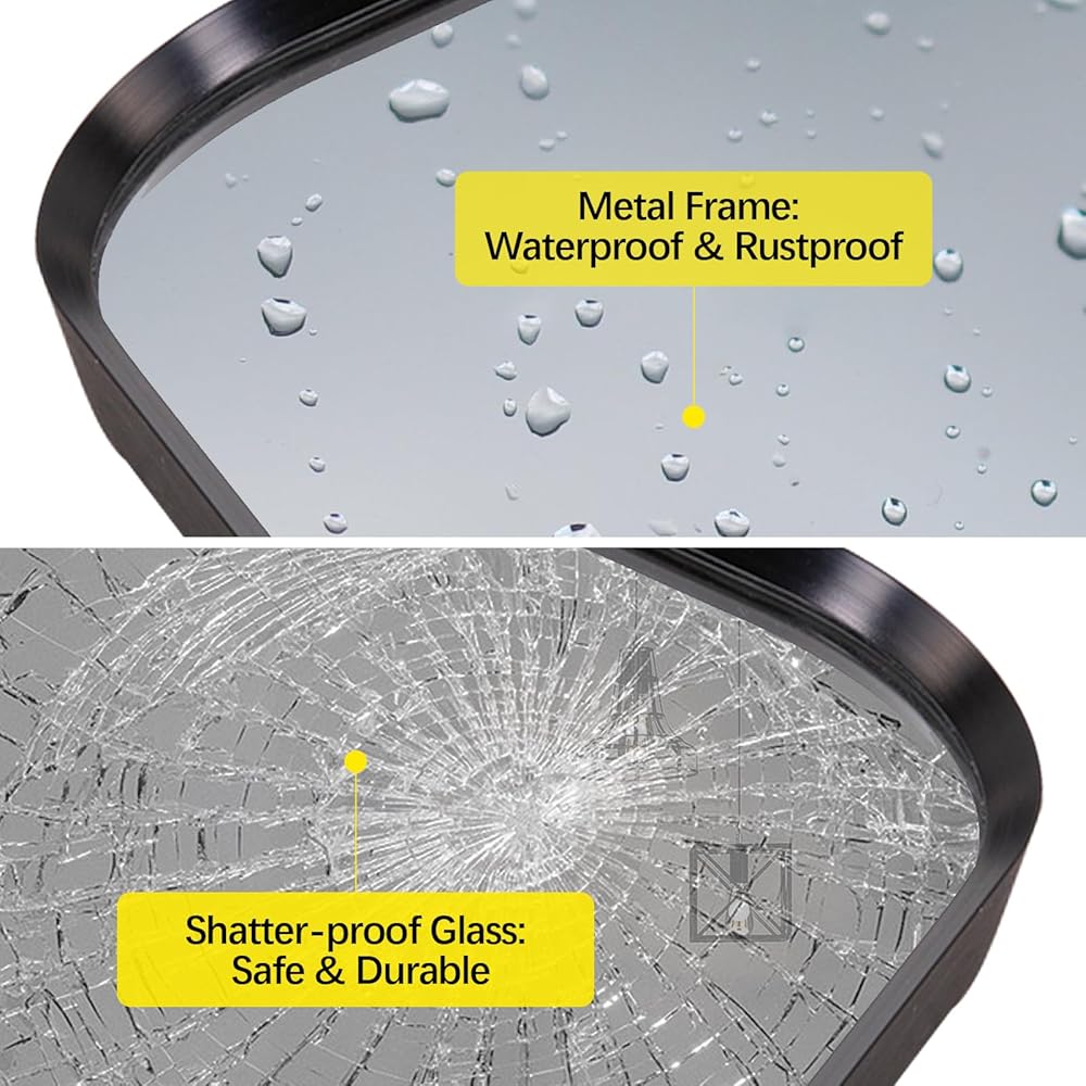 • إطار معدني مصقول ومقاوم للماء: الإطار المعدني لمرآة الحائط مصنوع من سبائك الألومنيوم عالية الجودة وطلاء الخبز السميك. يعتمد إطار سبائك الألومنيوم عملية مصقولة بالحبوب المستقيمة لإثراء اللمعان والملمس المعدني. عملية الأنودة تجعل الإطار المعدني مقاوم للماء ومضاد للصدأ. شكل متين وغير قابل للتشوه.