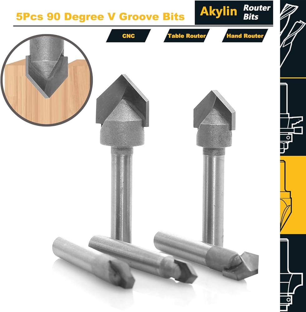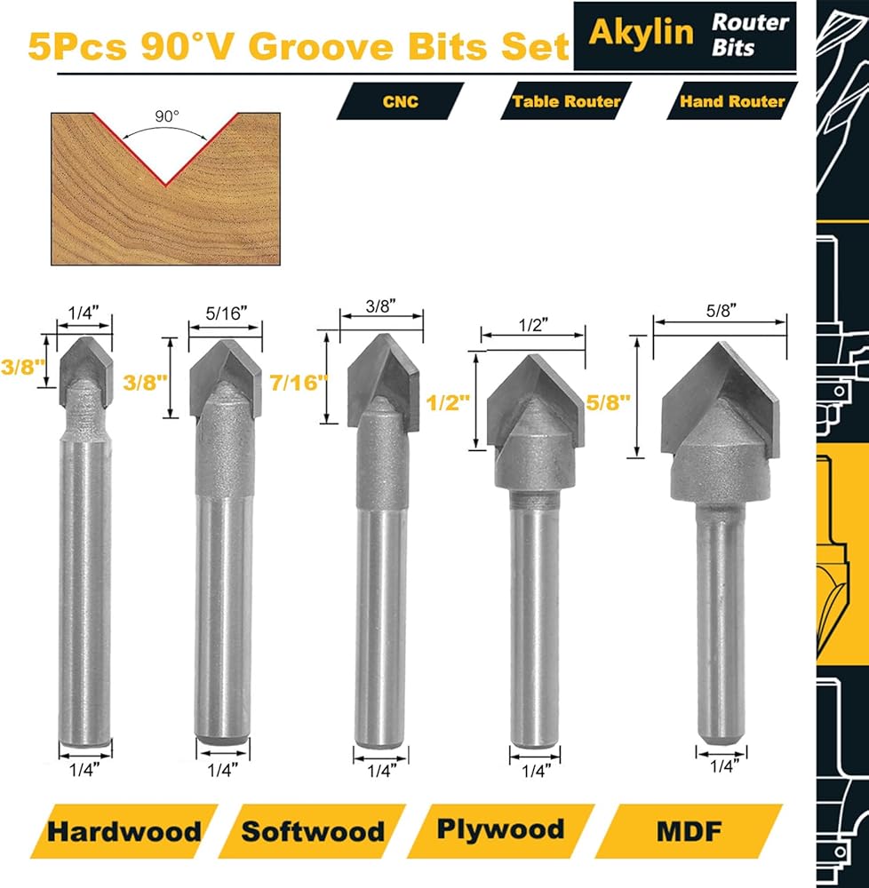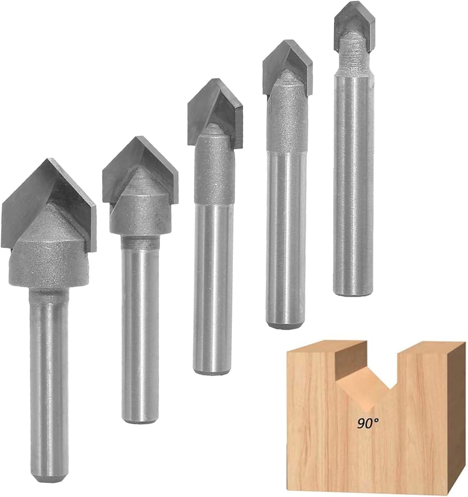 مجموعة لقم راوتر 90 درجة على شكل حرف V من اكيلين، ساق 1/4 انش، اطراف كربيد على شكل حرف V لنحت الخشب والنقش وصنع اللافتات - قطر القطع 1/4 انش، 5/16 انش، 3/8 انش، 1/2 انش، 5/8 انش