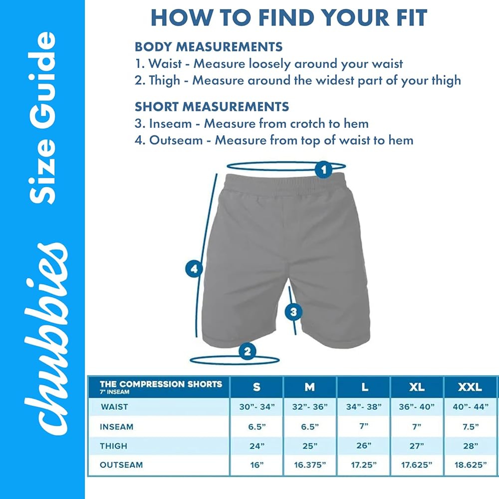 CHUBBIES LINED COMPRESSION SHORTS: The Chubbie's Compression Shorts feature an elastic waistband, 4-way stretch fabric, and butter soft compression liner. These athletic shorts are perfect for squats and roundhouse kicks.