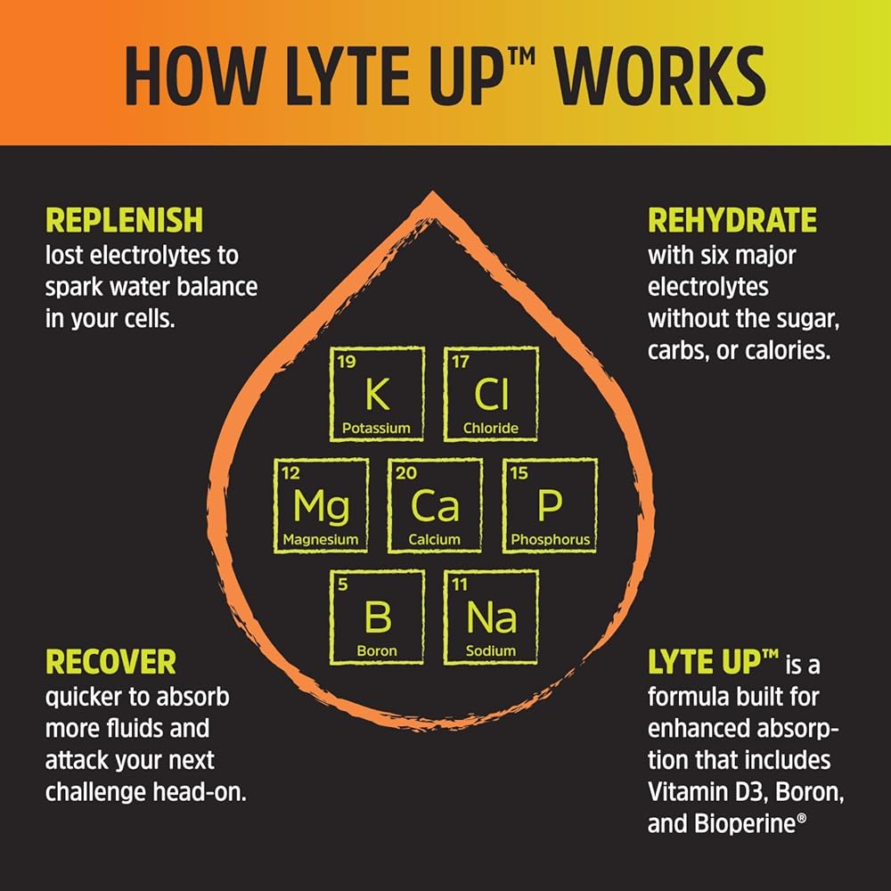 • ترطيب سريع. مركب الإلكتروليت المتطور من لايت اب موجود هنا للمساعدة في استبدال الإلكتروليتات التي تفقدها بعد تمرين جيد ومتعرق. تركيبة علمية لإعادة الترطيب السريع، توفر حبوب الملح لايت اب التوازن المثالي لـ 6 إلكتروليتات رئيسية حتى تتمكن من إعادة الترطيب بسرعة بغض النظر عن مدى صعوبة التمرين.