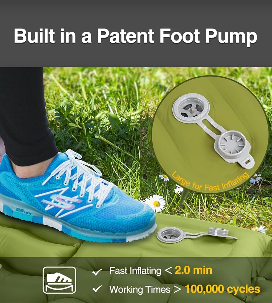 • 【مضخة قدم لسهولة النفخ】تحتوي على مضخة قدم قوية، وسادة التخييم ذاتية النفخ هذه سهلة النفخ. نصائح: تجدر الإشارة إلى أنه قبل البدء في النفخ، يرجى التأكد من إغلاق صمامي التفريغ الموجودين خلف الوسائد.