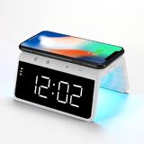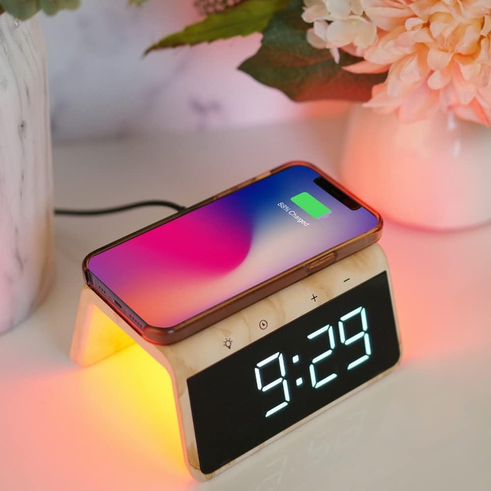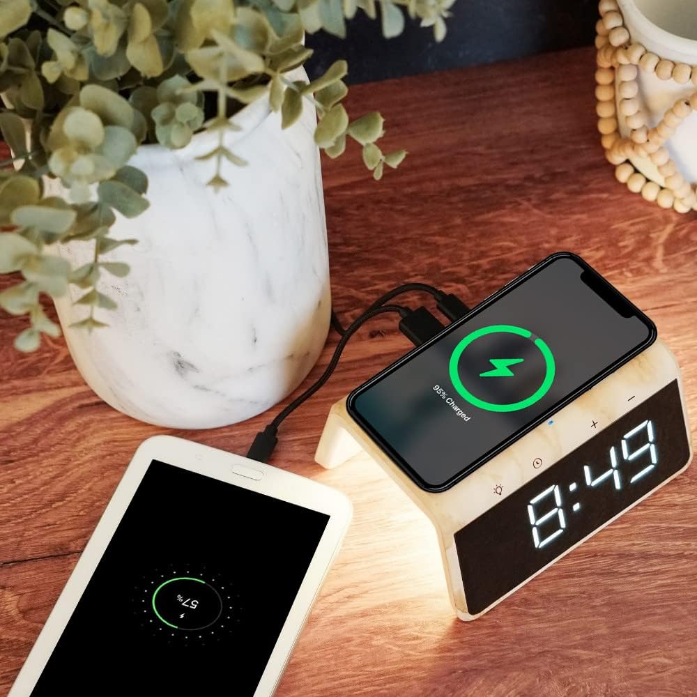 This power-packed device is the ultimate bedside device featuring a 2-setting alarm clock, 9-mode adjustable night light, and a dual charger! The Limitless PowerTrio is a 3-in-1 powerhouse perfect for any nightstand, desktop, or shelf. Preset the large digital clock display with two different alarms that include snooze and a built-in battery backup for peace of mind that your alarm will still sound during a power outage. Quickly charge mobile devices including phones, tablets, speakers, and more using the 15W wireless charger or the alternative USB port located on the back. The built-in nightlight creates a soft and soothing ambiance with nine color modes to customize any room's mood. Save space and combine your alarm clock, night light, and phone charger in to one convenient, yet mighty device!