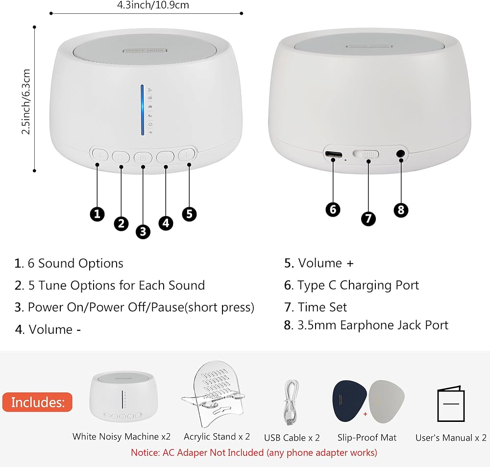 • استخدام متعدد الوظائف للخصوصية والتركيز: آلة صوت النوم الخاصة بنا متعددة الاستخدامات لليوغا والتأمل والعناية بالطفل والبيئات المكتبية. مع القدرة على ضبط مستوى الصوت، يمكن لجهاز الضوضاء هذا لخصوصية المكتب تغطية المحادثة بفعالية. تأتي المجموعة المكونة من قطعتين مع جهازين وحامل أكريليك و2 كيبل USB ووسادتين مطاطيتين (محول التيار المتردد غير متضمن)