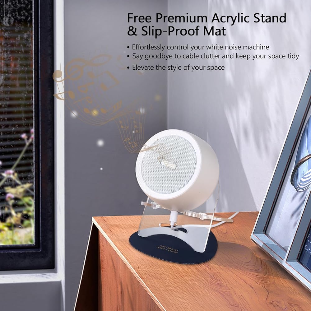 • حامل أكريليك فاخر: تم تصميم حامل أكريليك غير مرئي خصيصًا لآلة الضوضاء البيضاء الخاصة بنا، من خلال رفع الجهاز، يتم وضع الأزرار لأعلى لسهولة الضغط والتحكم. بالإضافة إلى ذلك، يساعد الحامل على تنظيم كابلات الشحن وسماعات الرأس وتعزيز الجمال العام لجهازك.
